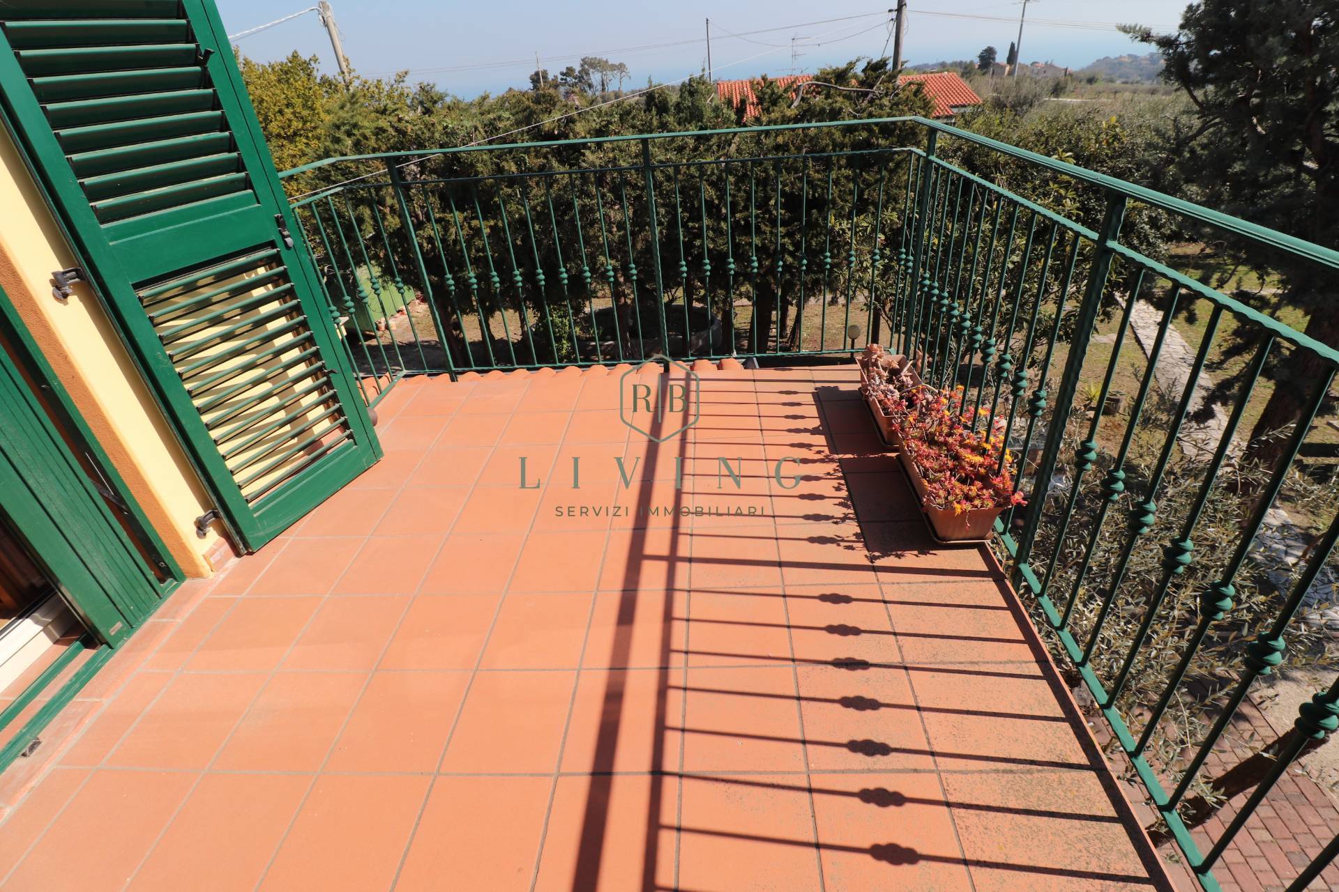 Composizione interna Piano Terra: ingresso principale e secondario con accesso al giardino, ampio soggiorno con camino, cucina abitabile, due camere da letto e un bagno; Piano Primo: due camere matrimoniali con cabina armadio, un bagno e tre balconi, di cui uno molto spazioso con splendida vista mare; Piano Seminterrato: comodo rustico con bagno, ideale come taverna o zona relax.