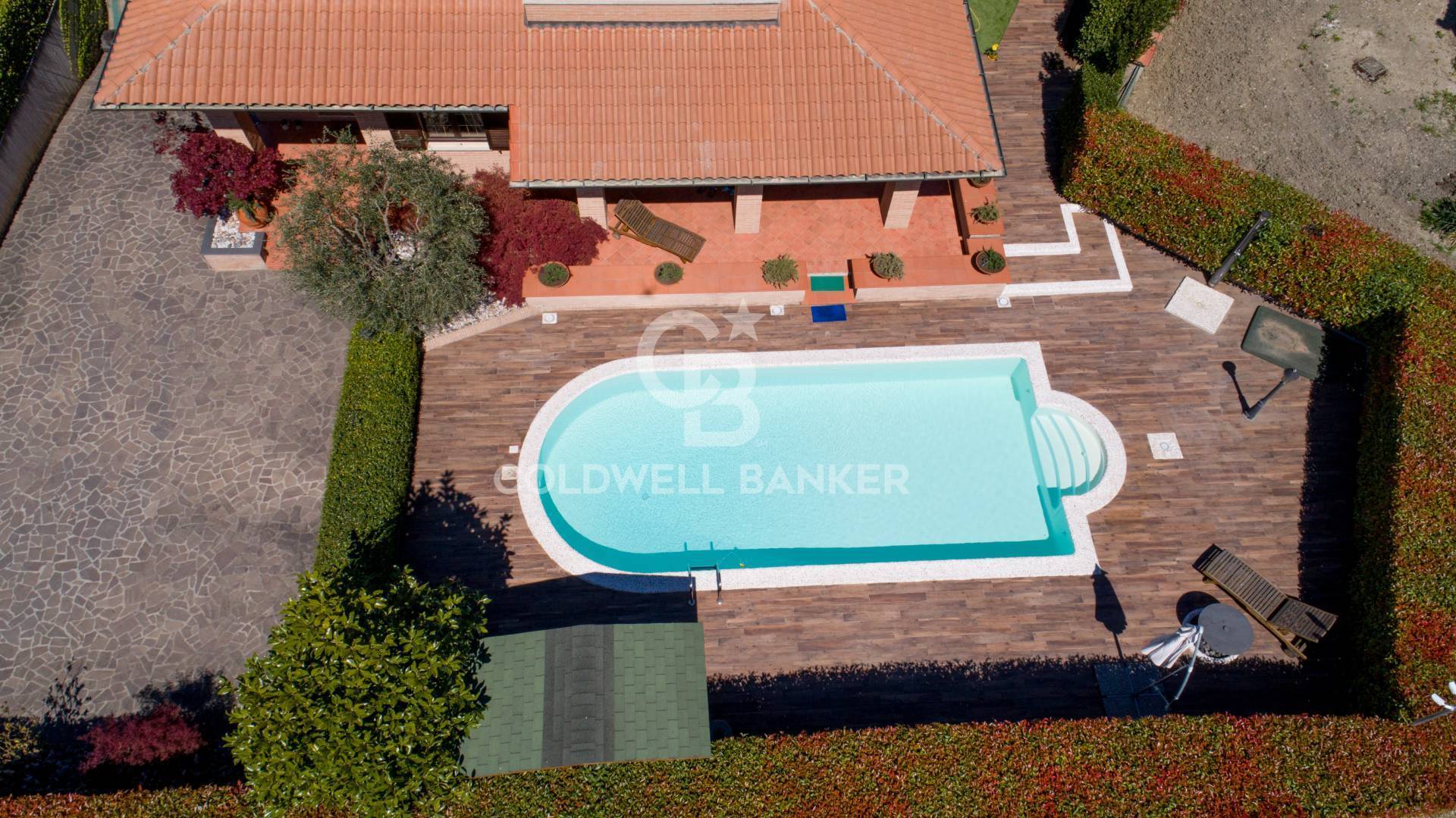 Ad arricchire ulteriormente la residenza piscina ad acqua salata, che riproduce le sfumature naturali di un ruscello, totalmente pavimentata con doccia, spogliatoio e rimessa attrezzi.