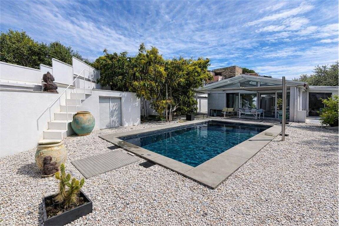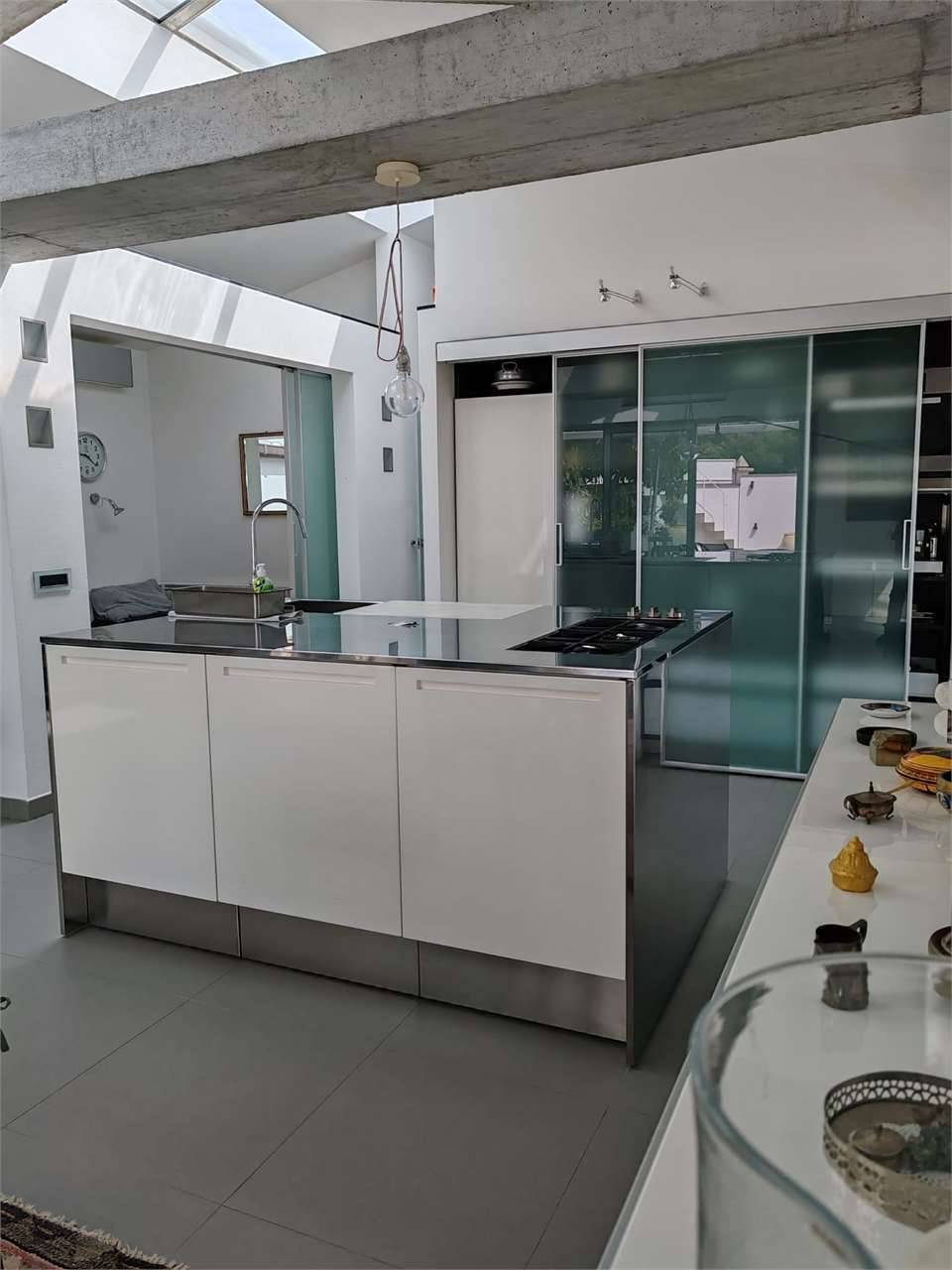 Si accede percorrendo un breve vialetto che attraversa una parte della corte privata, costeggiando la piscina fino allingresso in un ampio open space con cucina a vista e caminetto.
