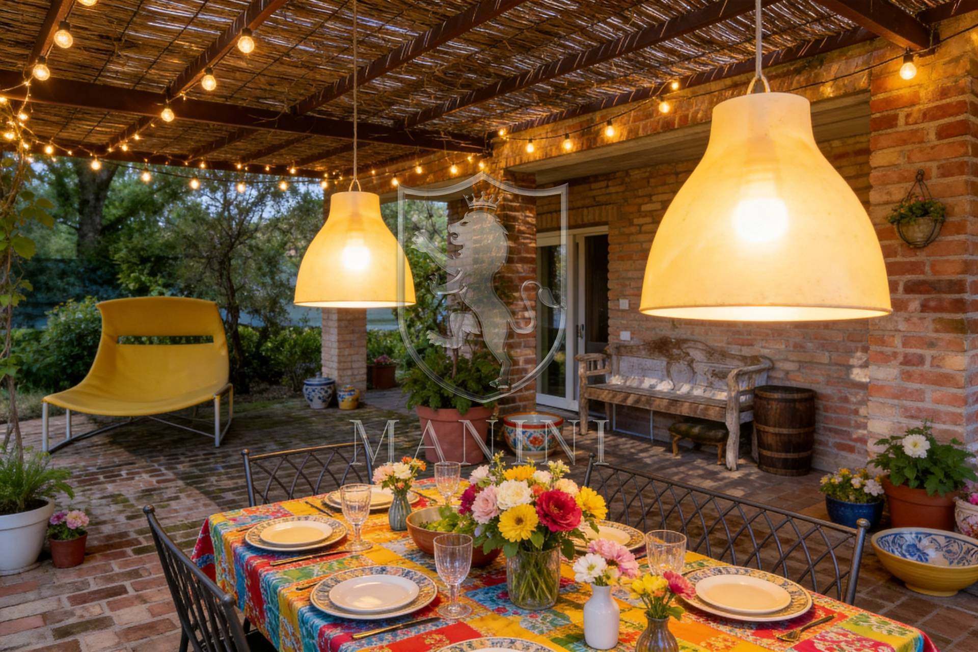 Il mattone faccia a vista, i pergolati ombreggiati e le aperture panoramiche dialogano con ambienti luminosi e impianti recentemente rinnovati, creando una residenza pronta da vivere.