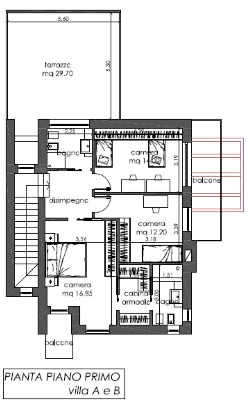 -al piano primo: camera matrimoniale con CABINA ARMADIO, bagno privato e piccolo balcone esclusivo, due camere da letto con accesso diretto all'ampio balcone comune, disimpegno, bagno.