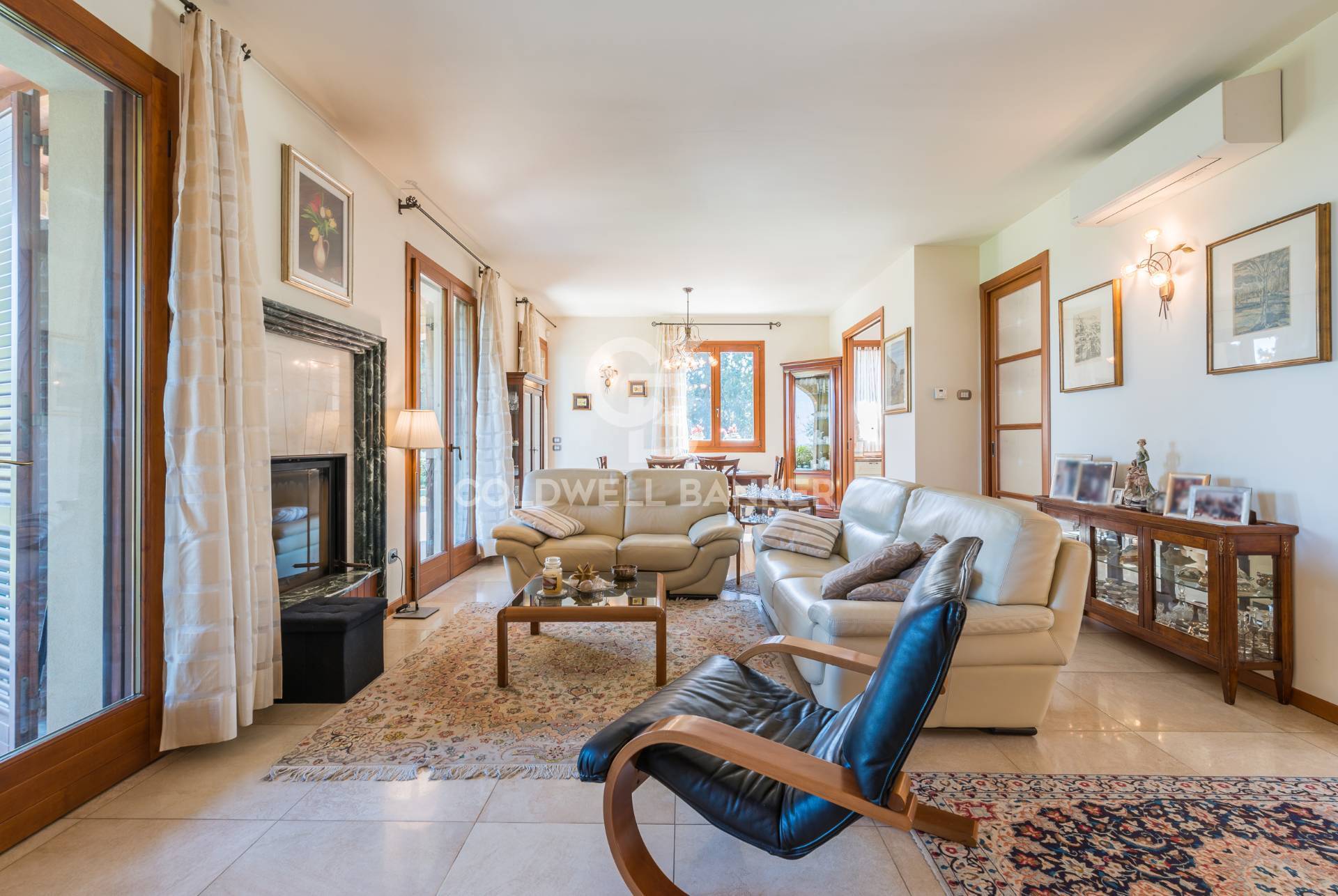 Al piano terra si sviluppa una zona giorno luminosa e accogliente, composta da soggiorno con camino e affaccio sul portico, zona pranzo, cucina abitabile separata e studio, facilmente adattabile anche a stanza ospiti.