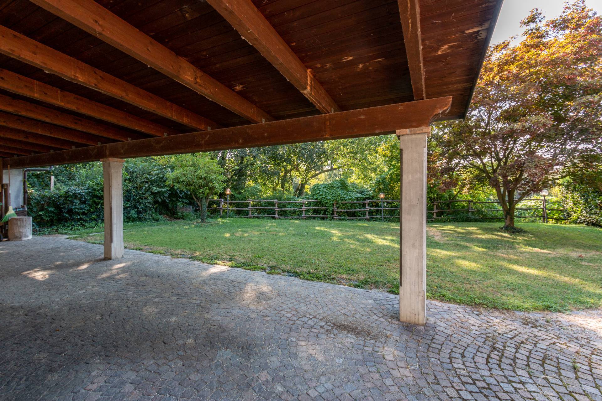 Completa la propriet un giardino pianeggiante, al cui livello presente un magazzino ristrutturato di 145 mq (accatastato come autorimessa, che non viene conteggiato nella metratura commerciale complessiva, ma che incluso nel prezzo), un box auto doppio (sempre incluso nel prezzo) e una tettoia usufruibile anche come posto auto coperto.