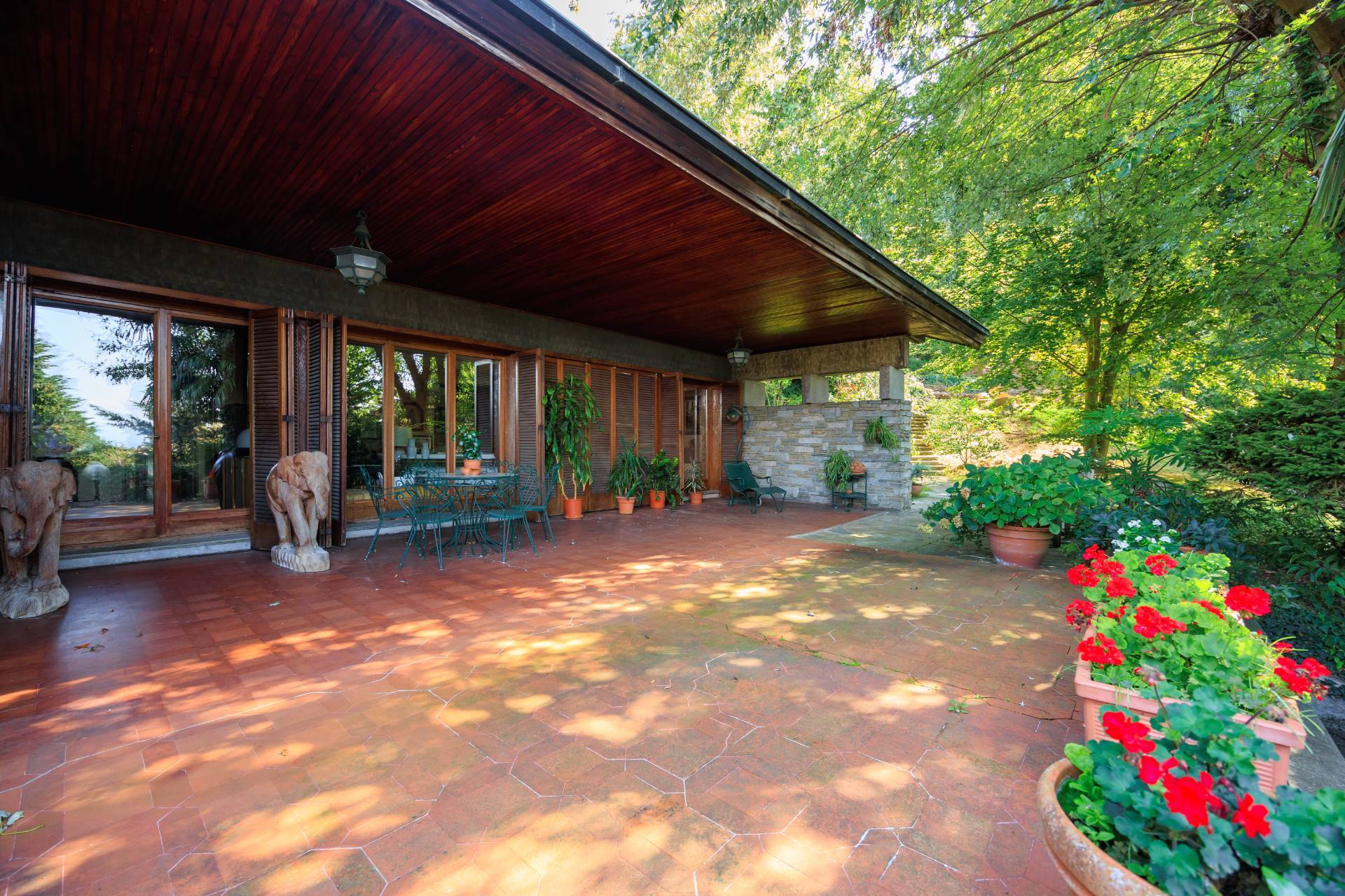La villa circondata da un giardino piantumato e curato, Il grande portico coperto e la terrazza panoramica creano un naturale prolungamento della zona giorno verso lesterno.