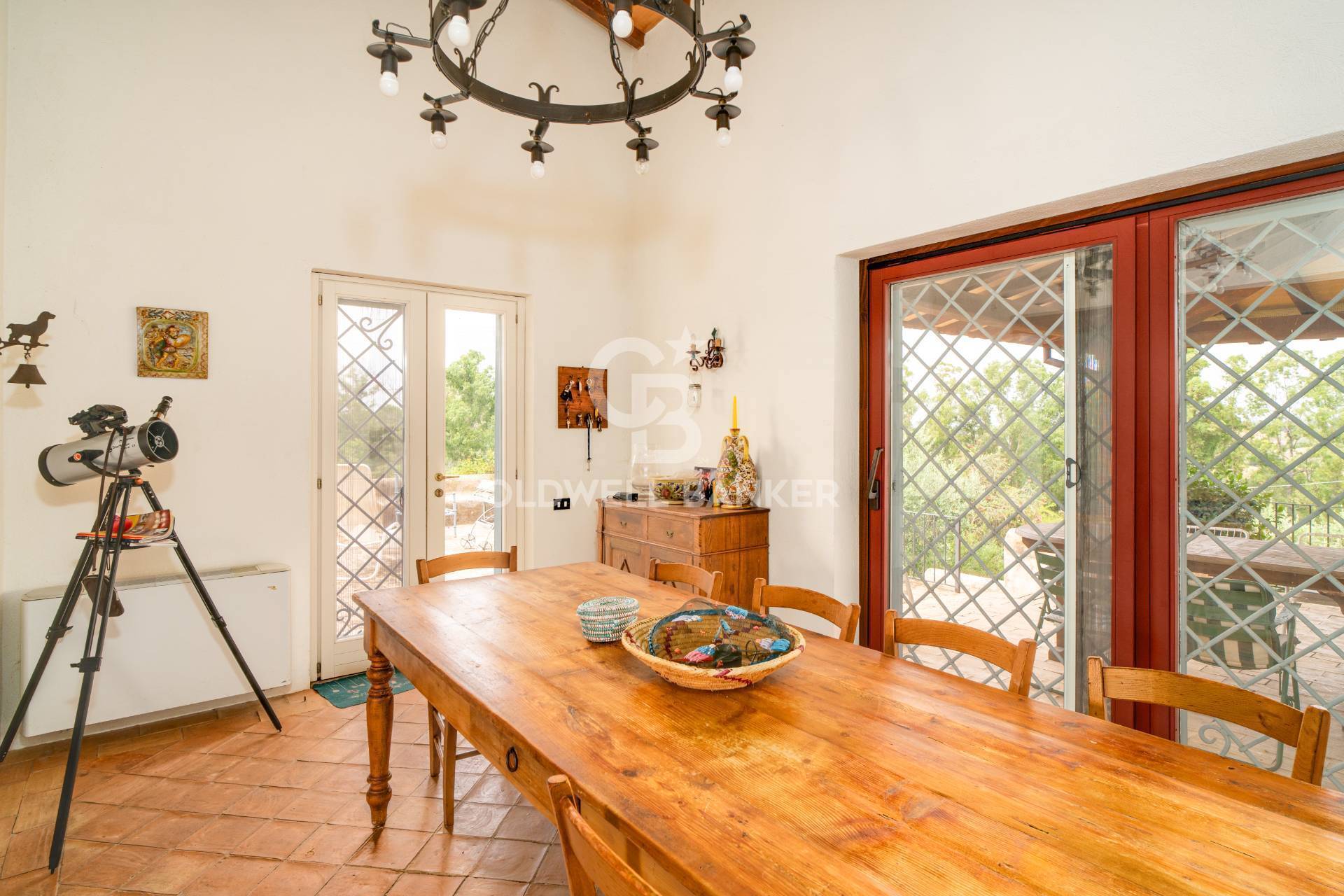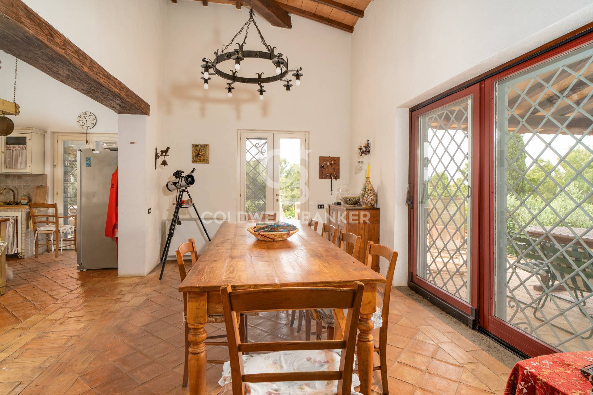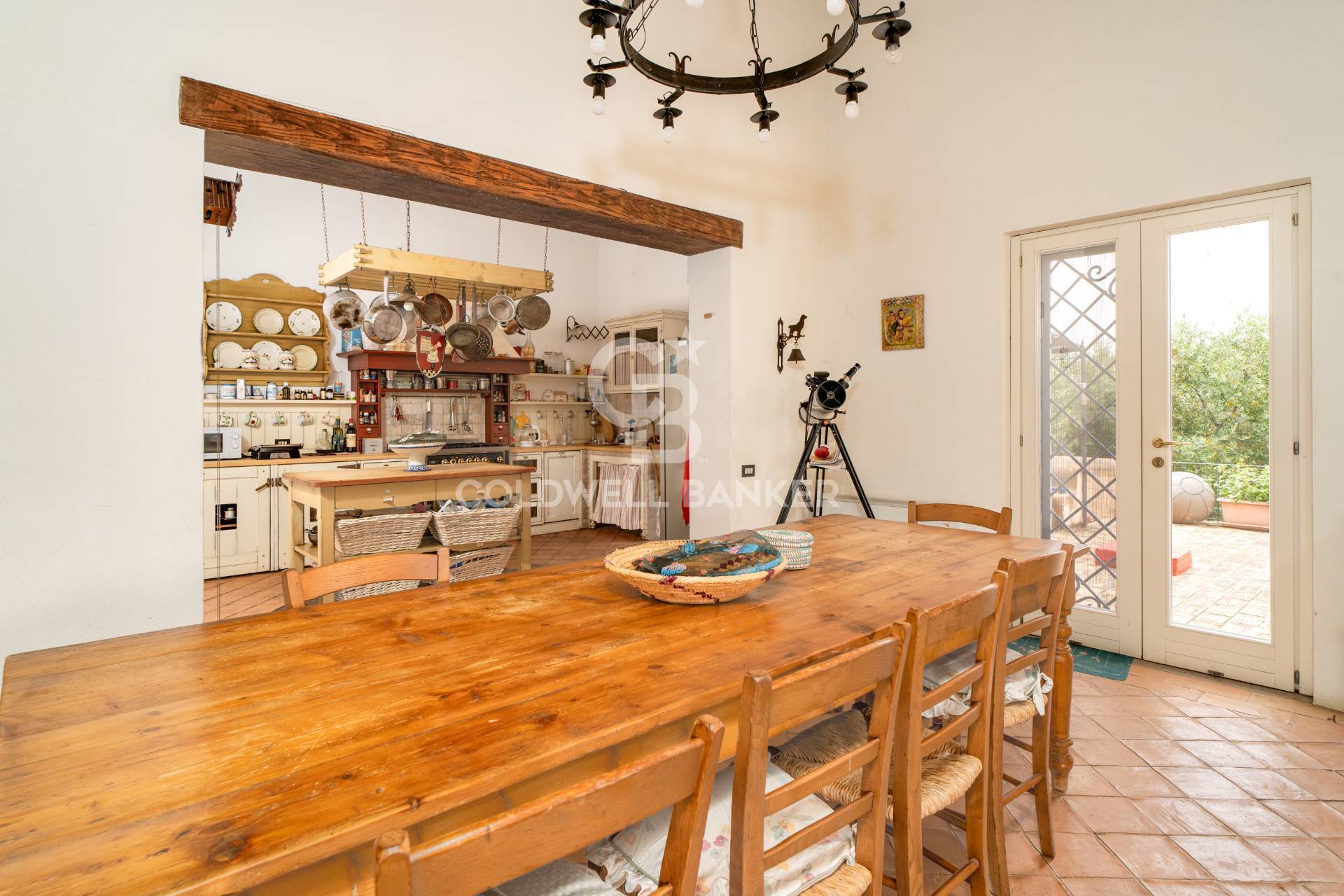Una volta varcato il cancello carrabile, e percorso il viale alberato d'ingresso, si raggiunge la villa posizionata sul crinale della collina e tutta l'area esterna che la circonda, dove possibile parcheggiare le autovetture al riparo sotto l'apposita tettoia, o percorrendo i vari viottoli in ghiaia, possibile girare a piedi l'intero parco, costituito da numerose piante tipiche della macchia mediterranea, alberi ad alto fusto, aiuole e da 150 piante di ulivi; possibile inoltre arrivare alla zona relax con il prato all'inglese e i gazebi dove posizionata la piscina, trascorrendo dei pomeriggi in compagnia di parenti ed amici godendosi un po' di sole e rinfrescandosi di tanto in tanto in questa vasca d'acqua cristallina! Oltre al grande parco, la propriet presenta esterni di ampia metratura a livello dell'abitazione come per esempio i 125 mq di portico che costeggiano su due lati la villa, dal quale si ha l'accesso diretto alla casa, e che possono essere sfruttati da quasi tutti gli ambienti che compongono i 250 mq del piano terra, come ad esempio dal salone, cucina e tinello per cene all'aperto, rinfrescati dalla brezza della sera, o per una deliziosa colazione visto l'accesso da una delle camere presenti al piano.