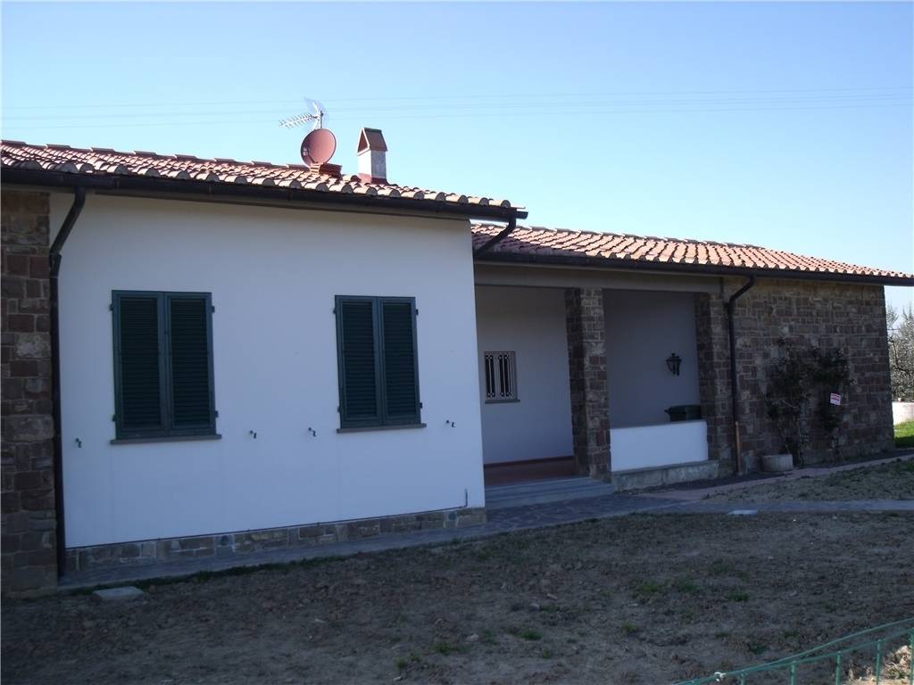 L'immobile si sviluppa al piano terreno ed e' composto da: ingresso, cucina, grande soggiorno con camino, tre camere matrimoniali, due bagni, ripostiglio/lavanderia, locale caldaia, due grandi vani adibiti a garage e rimessaggio, ampio loggiato di mq. 30 circa, oltre grande giardino su quattro lati con oliveta per un totale di 5.000 mq. Circa.