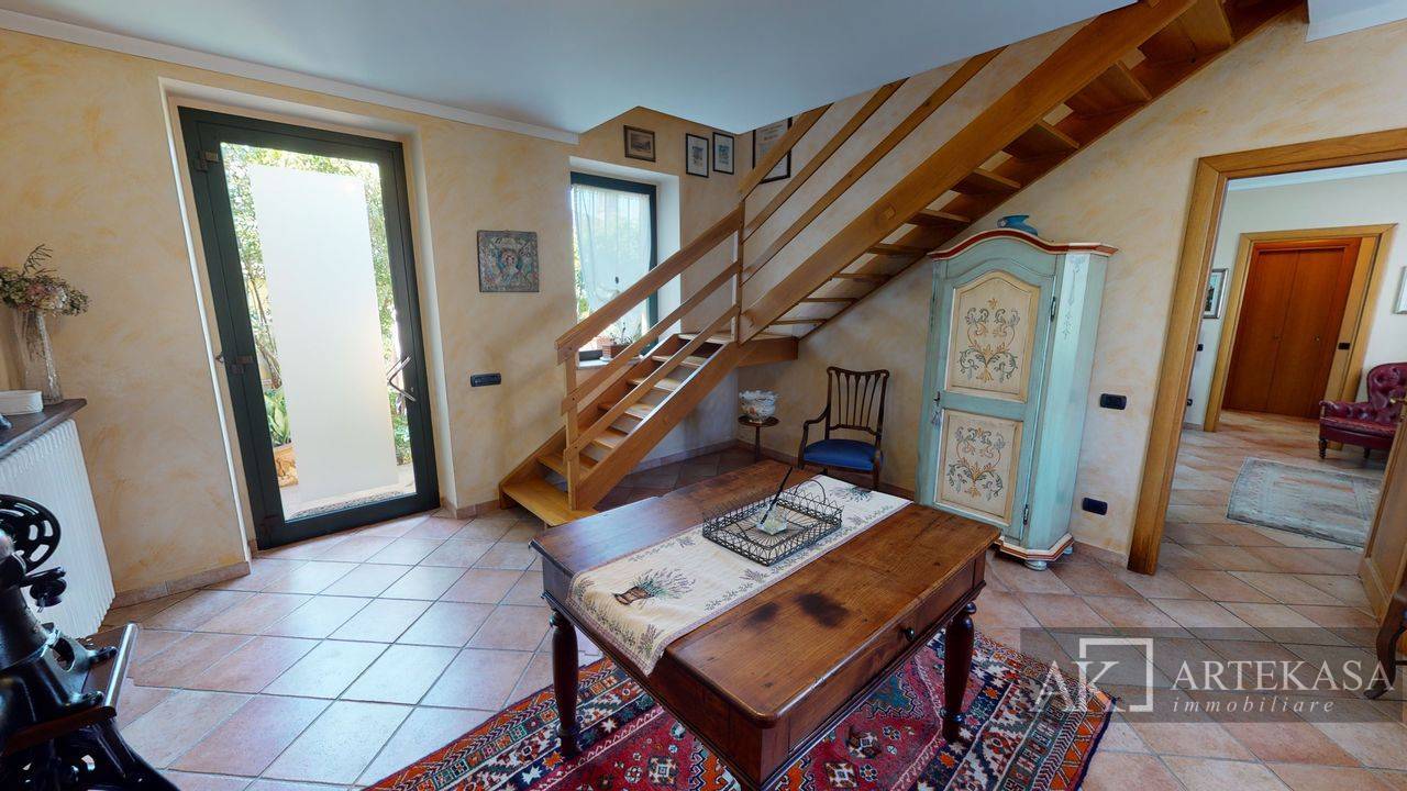 Al primo piano, con accesso da una comoda scala in legno, si sviluppa il soggiorno, la cucina di grandi dimensioni con un bellissimo soffitto in legno, che si affaccia su un piacevole terrazzino con vista sul giardino interno, la lavanderia/dispensa, proseguendo troviamo inoltre una camera con cabina armadi ed un bagno.
