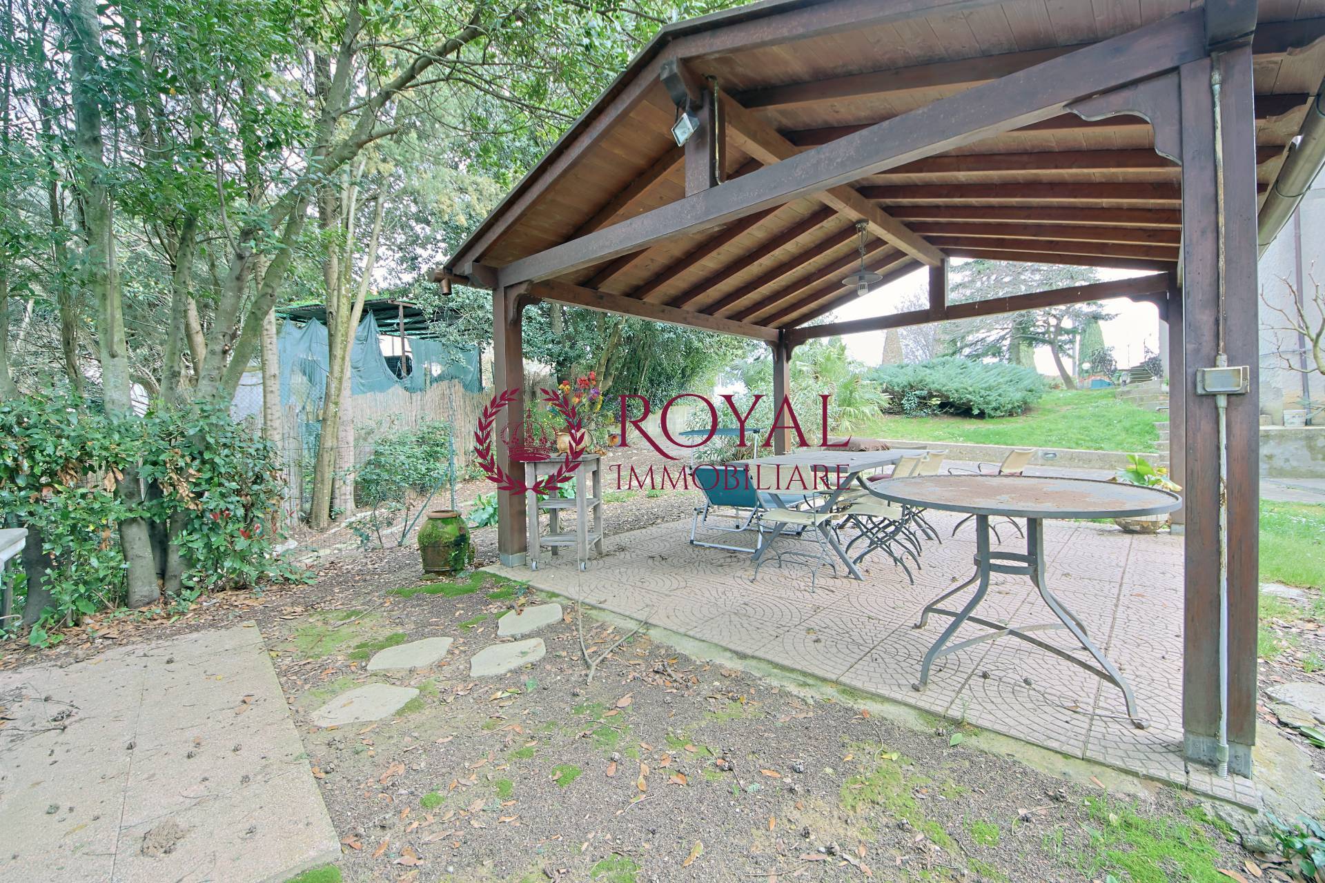 L'Ingresso avviene tramitre cancello automico dove poter accedere con l'automobile direttamente nel grande giardino di 500 metri, dove un comodo gazebo in legno d la possibilt di poter godere dello spazio esterno nelle fresche sere d'estate ed un pratico casottino adiacente con annesso cucinotto garantisce praticit.