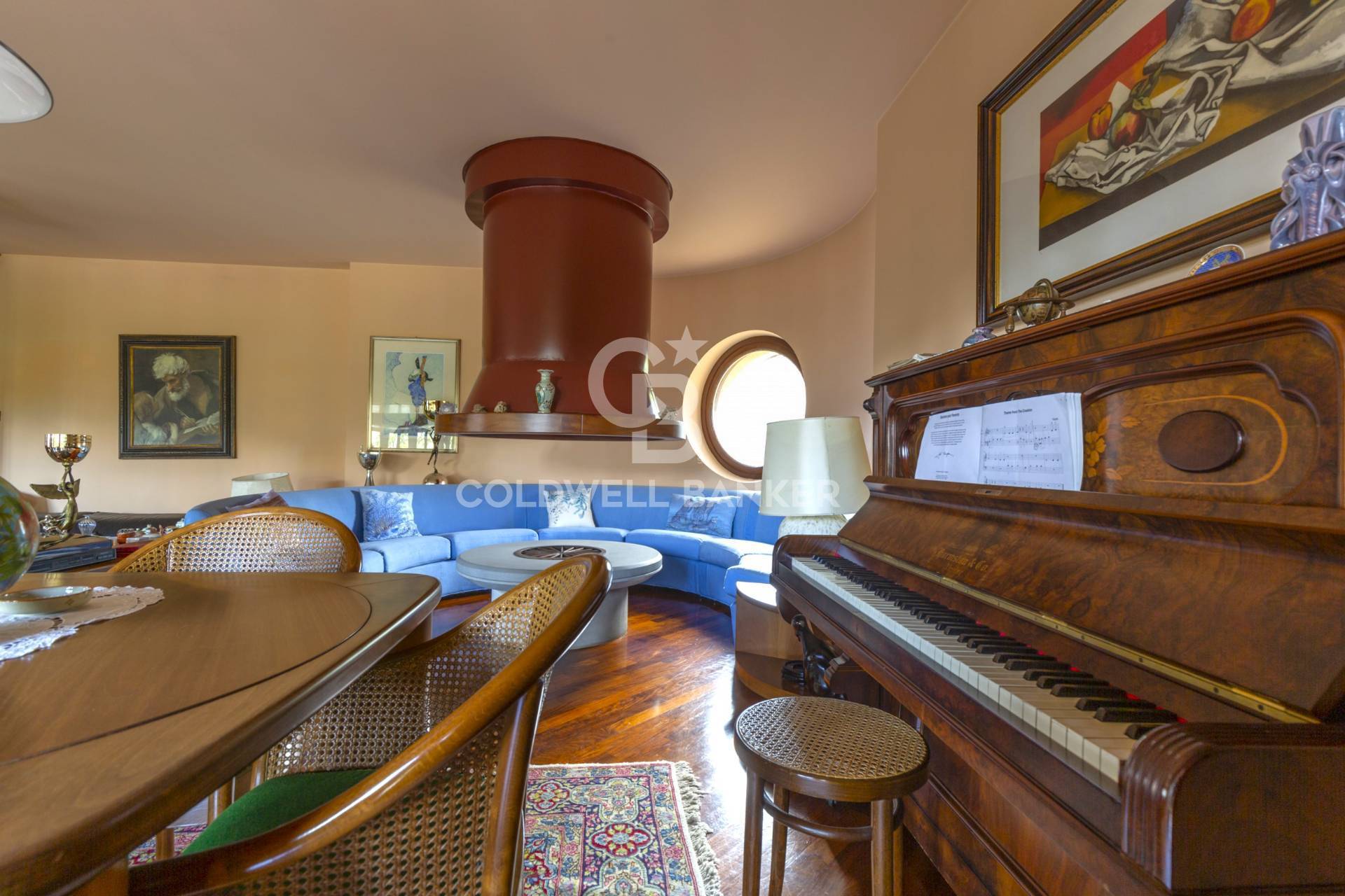 Un'ampia zona living al piano terra, composta da due ampi soggiorni di cui uno con camino e ampie vetrate, cucina, luminoso salotto, studio con ulteriore camino e bagno.