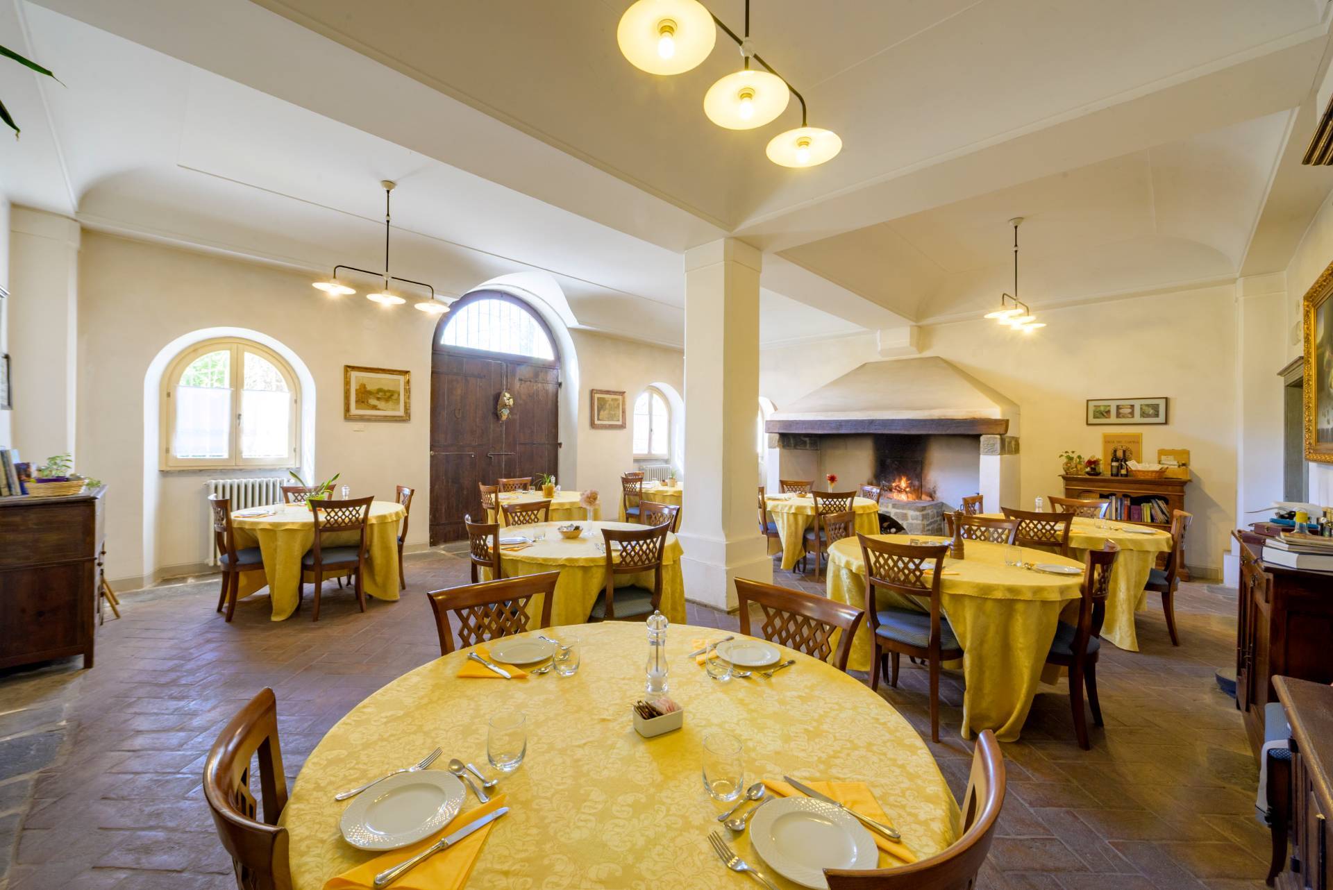 Al piano terra si trovano un ampio salone con camino, una cucina professionale, due ulteriori sale, due bagni, una dispensa, diversi magazzini e locali tecnici.