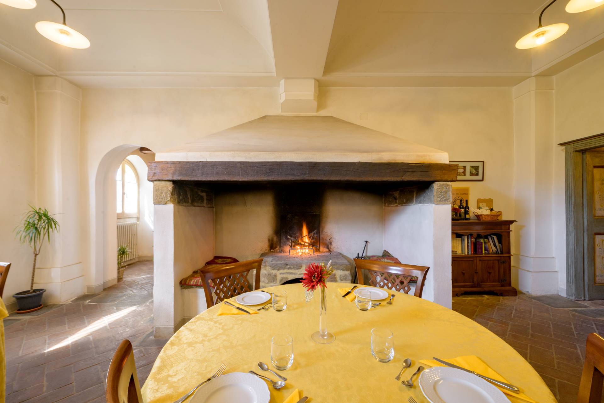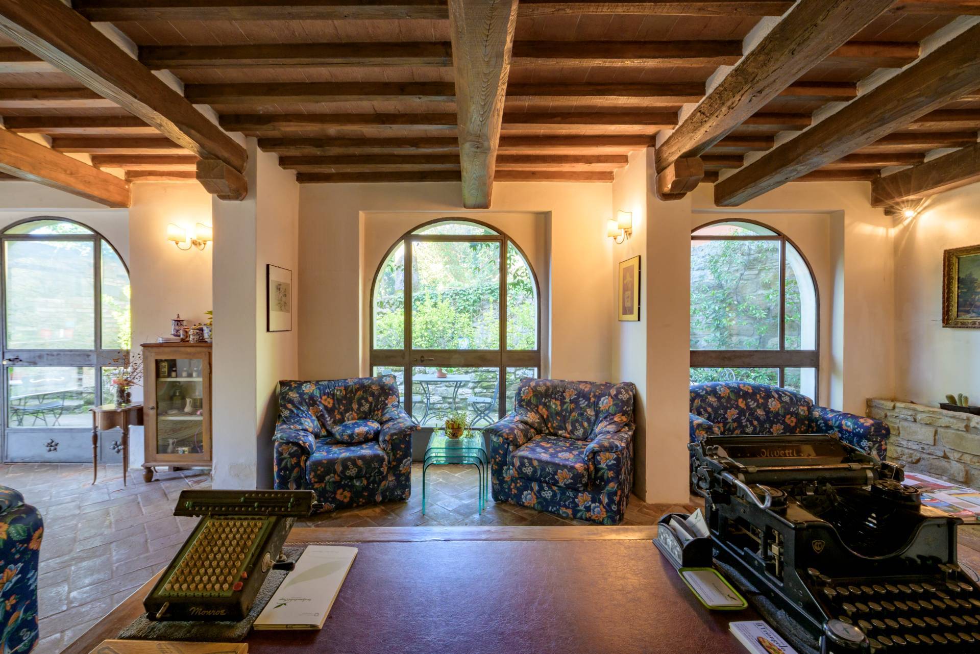 Dallatrio, impreziosito da tre grandi vetrate ad arco, si accede a un lastricato esterno: uno spazio ideale per momenti di convivialit e relax.