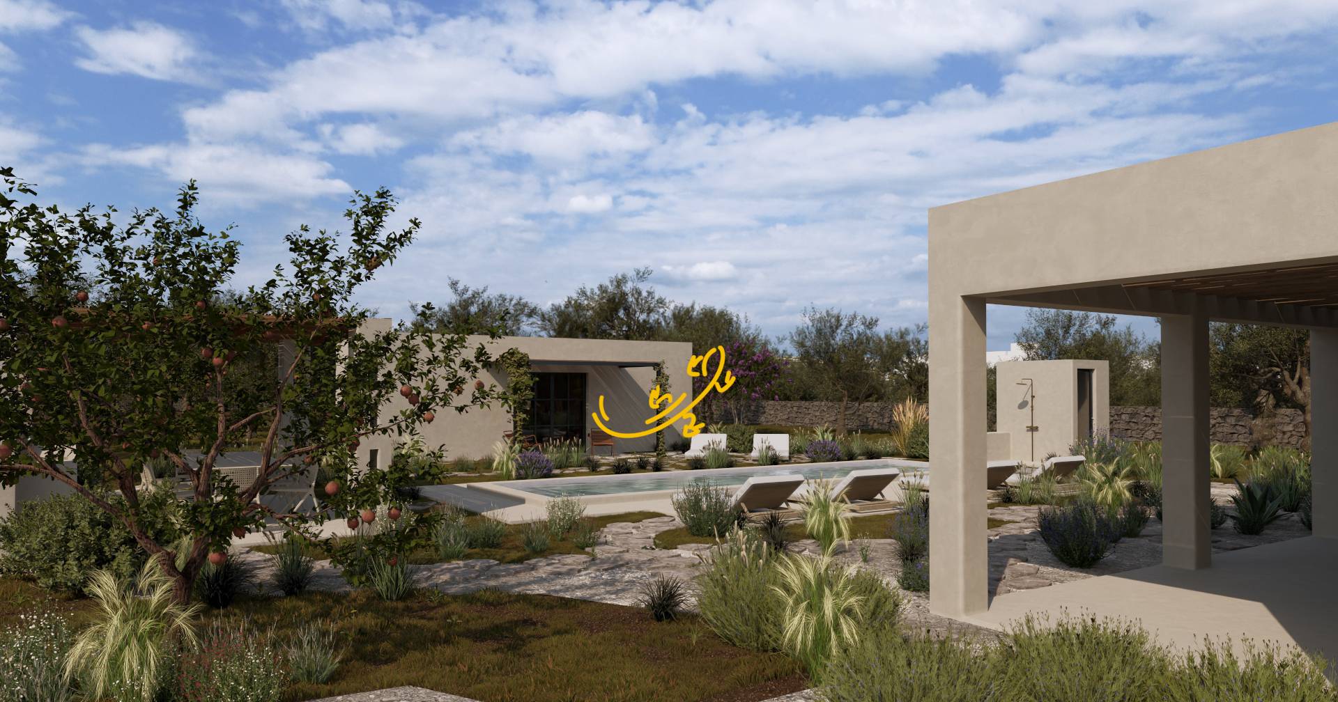 Ampie aree verdi piantumate con ulivi, alberi da frutto e piante ornamentali, che offrono unatmosfera mediterranea unica.