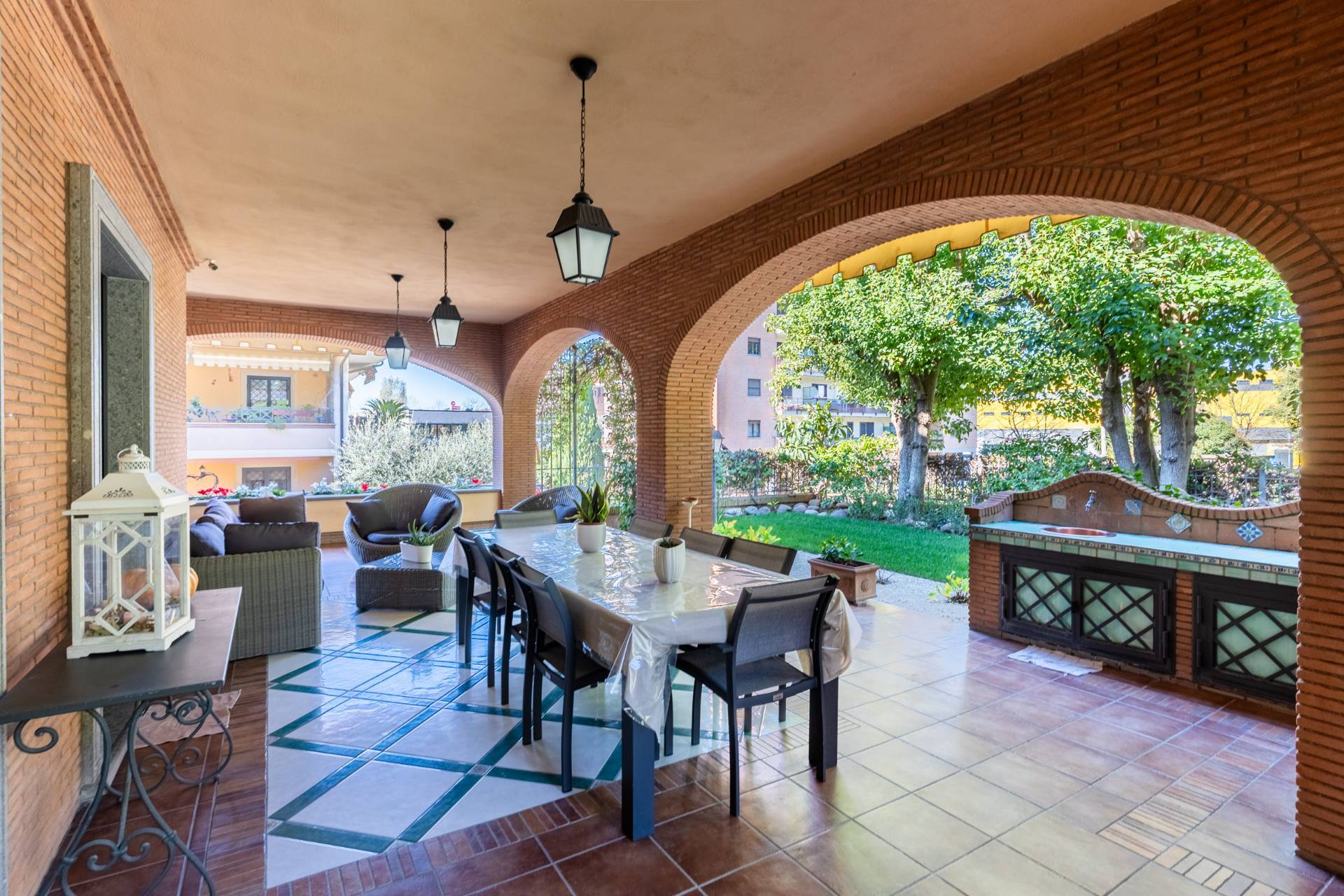 POMEZIA VIA TITO LIVIO La Coldwell Banker lieta di proporre in vendita una splendida ed esclusiva villa di 400 mq commerciali dotata di rifiniture di pregio disposta su pi livelli ed composta da una luminosa zona giorno al piano terra che si compone di un salone con camino, cucina abitabile, camera da letto, bagno, meravigliosa veranda ad angolo di mq 60 dotata di forno a legna e uno splendido giardino di 300 mq c.a. disposto su tre lati; la zona notte posta al primo piano collegata da una sontuosa scala in marmo Calacatta e ferro battuto composta da tre camere da letto, di cui una con cabina armadio doppio livello completamente rivestita in legno e bagno en suite dotato di vasca/doccia idromassaggio, oltre ad un bagno con doccia e due ampi balconi; al piano seminterrato troviamo un luminoso ampio salone con cucina a vista dotata di forno a legna, interamente rivestita con ceramiche di Vietri, bagno, disimpegno, camera da letto con bagno, lavanderia e uno spazioso ripostiglio.