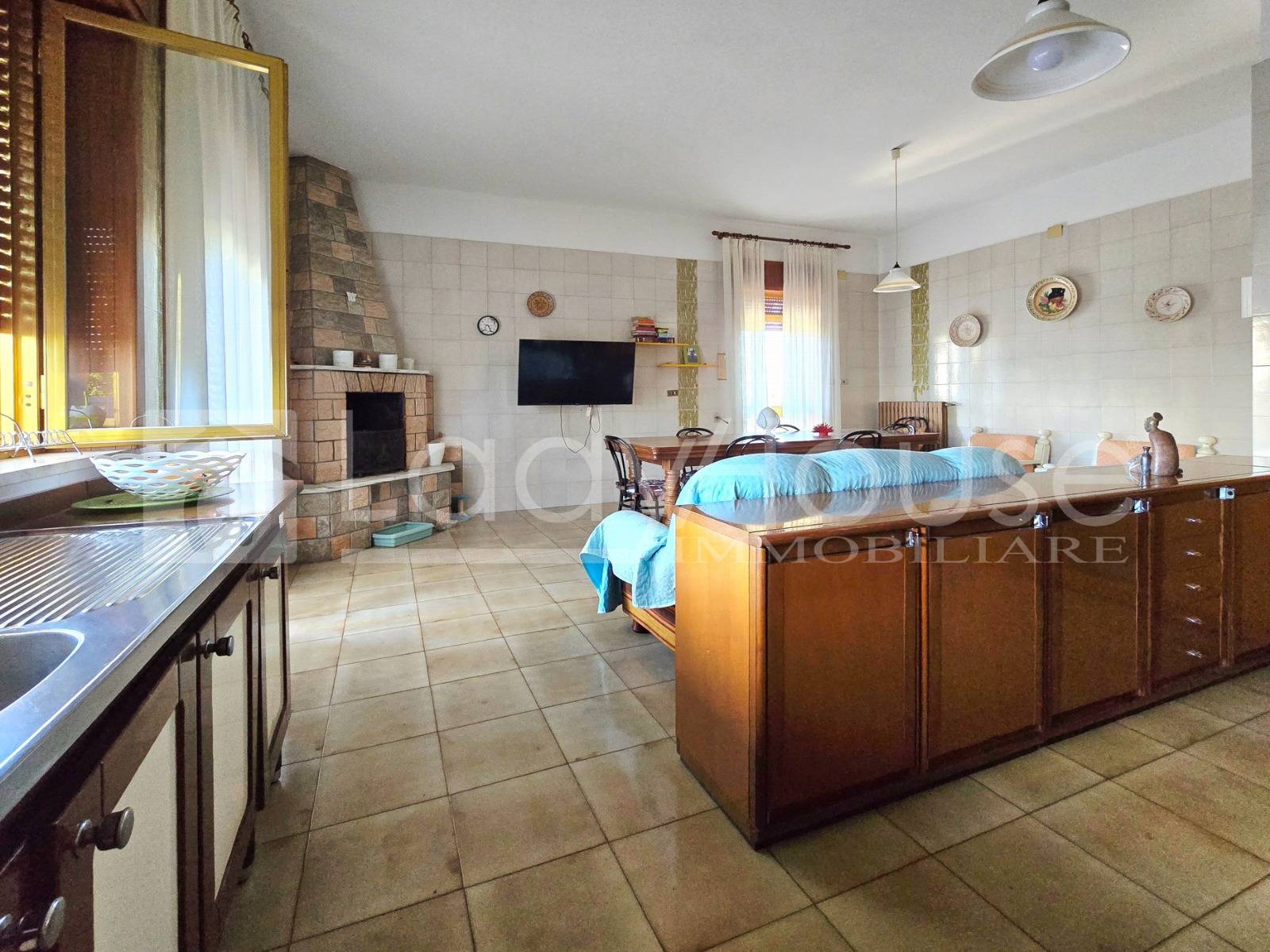 Il soggiorno collegato alla zona pranzo, dotata di tavolo, angolo cottura e anch'essa dispone di un ulteriore camino.