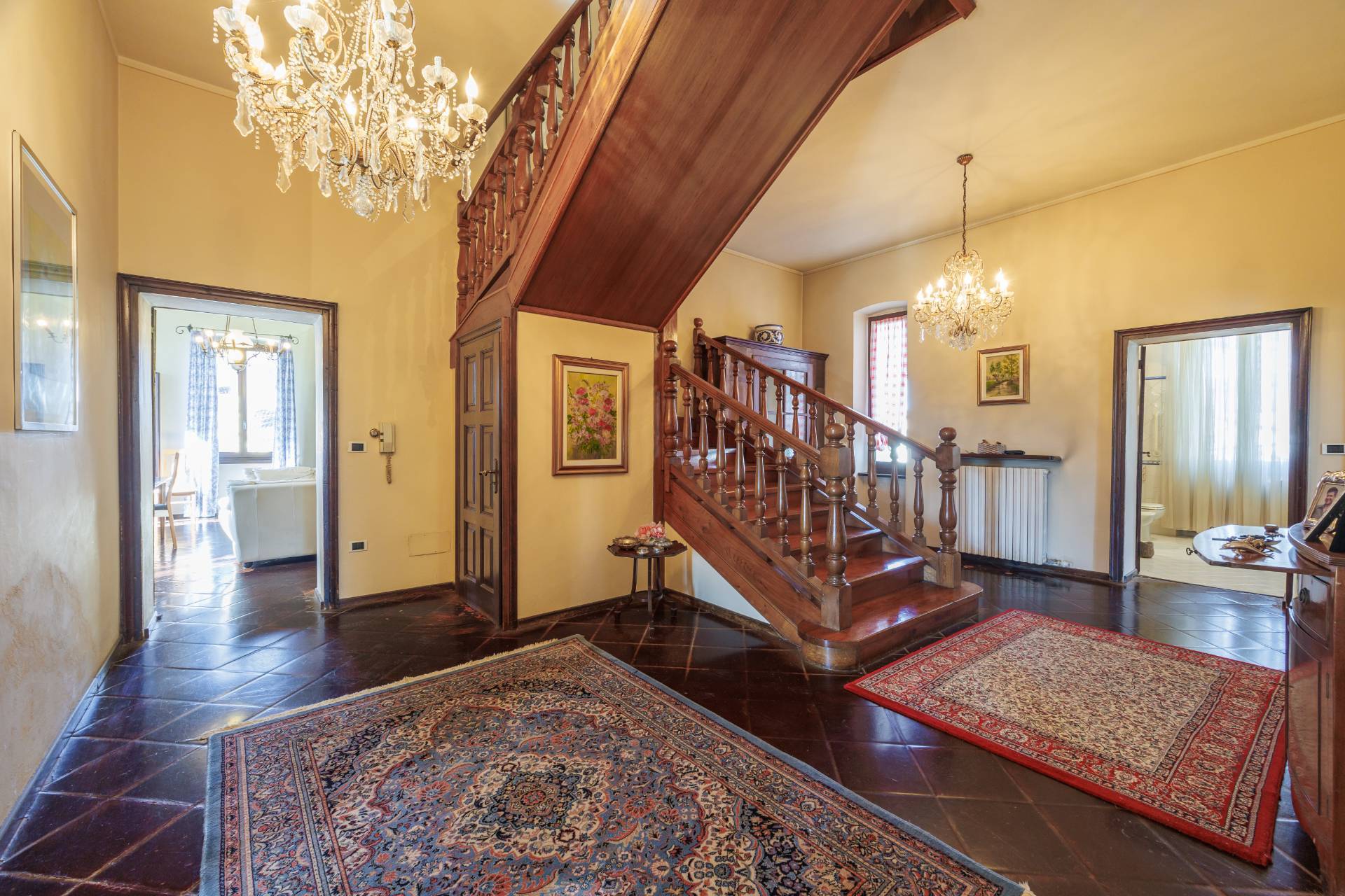 Una comoda e ampia scala interna in legno conduce al piano superiore, dove trovano spazio tre camere da letto e un secondo bagno, garantendo ambienti generosi e versatili, adatti anche a studio o stanza hobby.
