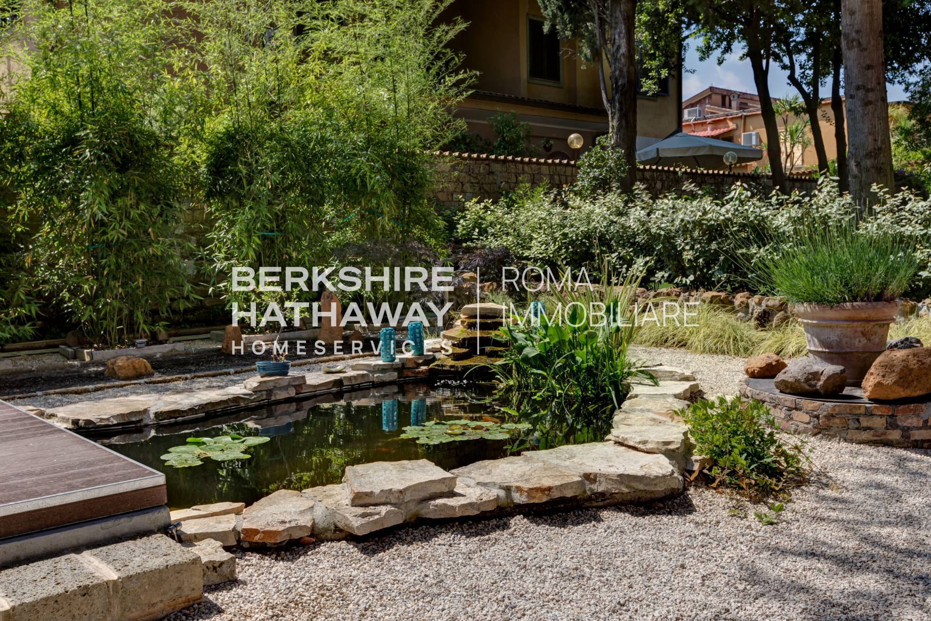 All'esterno, un giardino semi-perimetrale perfettamente curato, arricchito da un raffinato laghetto ornamentale giapponese, invita alla contemplazione e al relax, regalando un'atmosfera di pace e serenit.