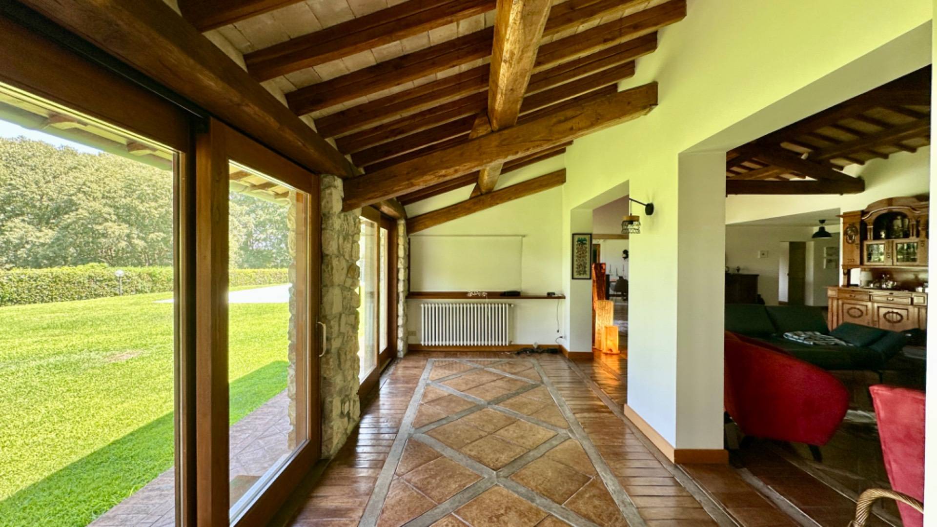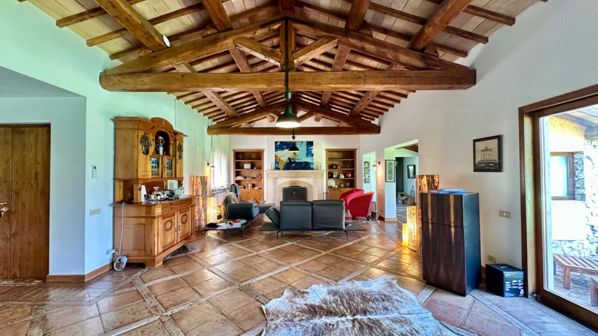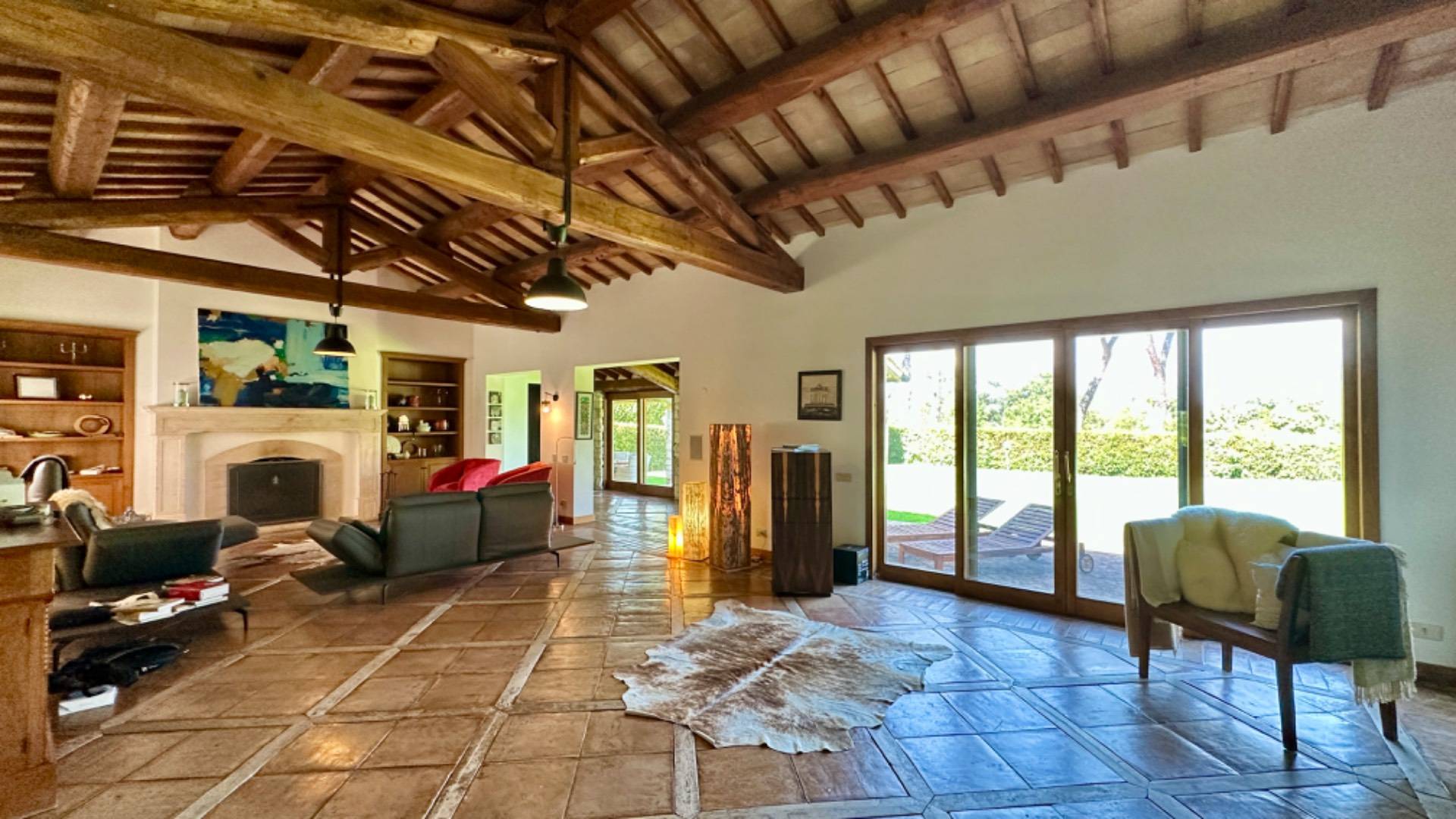 L'importante ingresso ci accompagna nella grande zona living con camino oltre ad altri spazi dedicati alla televisione ed alla lettura, le ampie vetrate fino a terra creano continuit con il verde del giardino e l'azzurro della piscina.