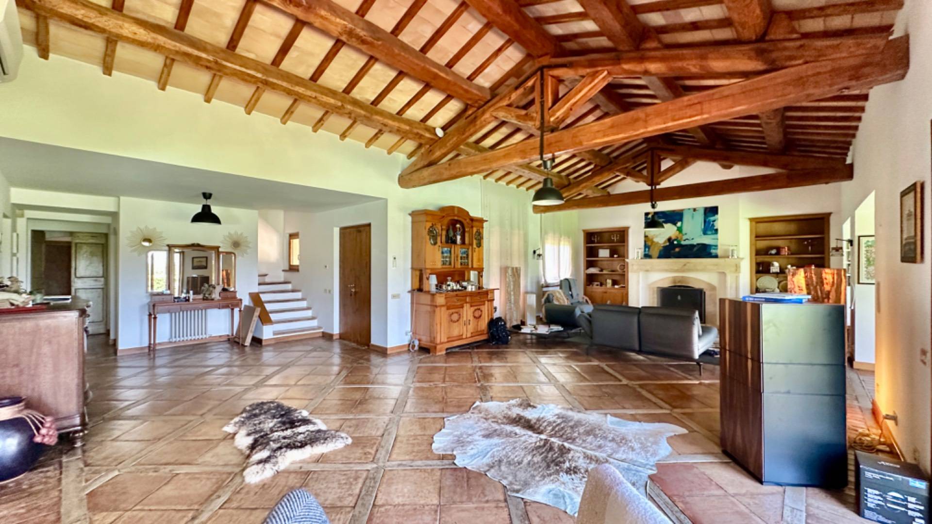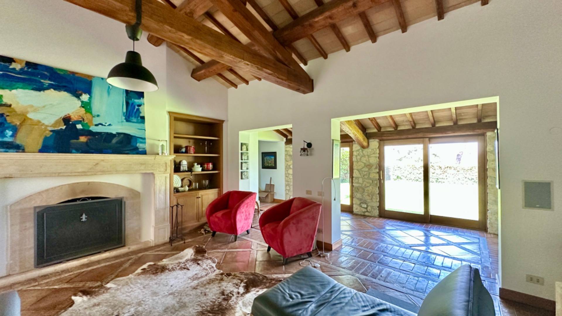 Sempre allo stesso livello una spaziosa sala da pranzo comunica con l'ampia cucina molto bene organizzata, anch'essa dotata sia di fuochi che di un grande camino/ forno, Una prima zona notte composta da due camere matrimoniali ognuna con il proprio bagno ed un servizio per gli ospiti completano questo spazio.