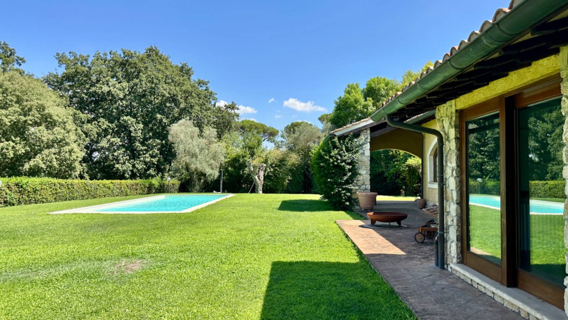 Un ampio giardino con piscina abbracciano tutto l'immobile.