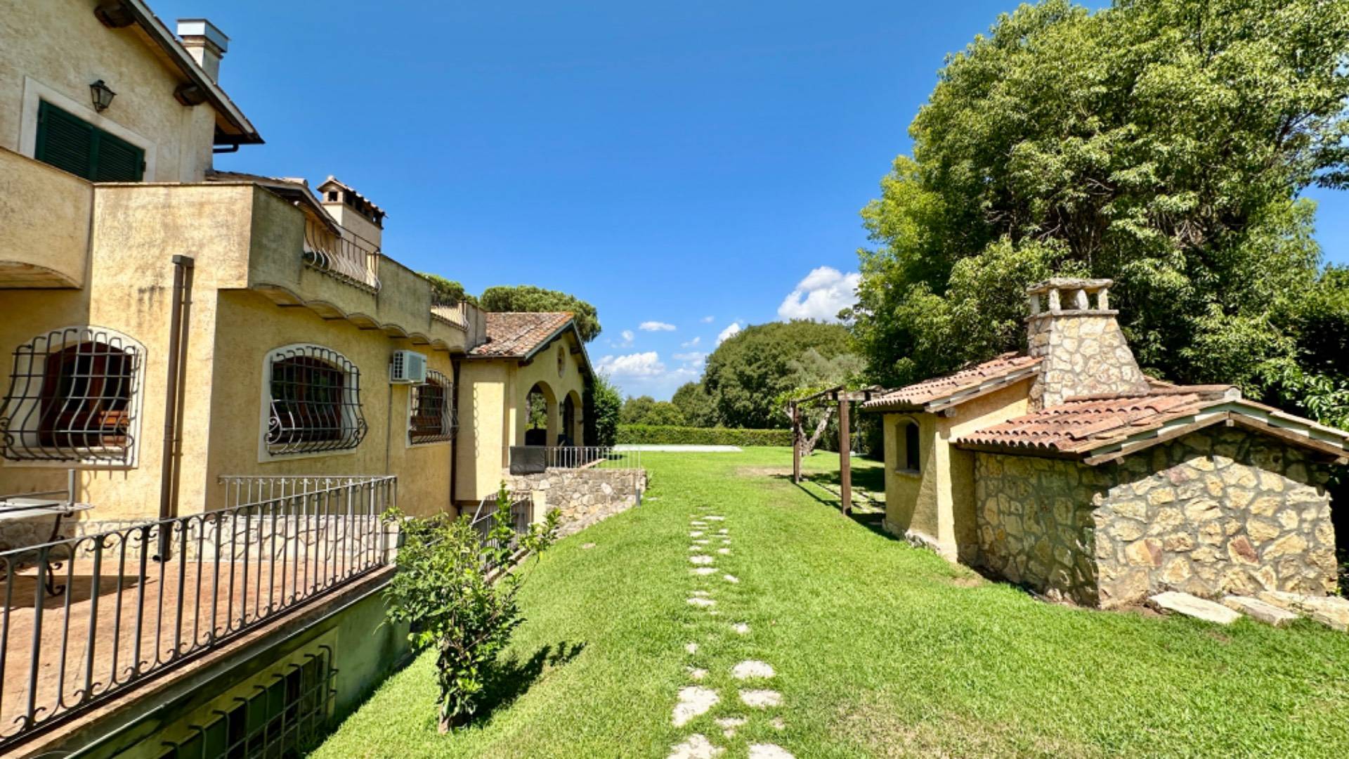 Il giardino completamente pianeggiante ed servito da due spazi coperti dedicati uno al relax adiacente alla piscina mentre l'altro vicino alla cucina servito da un comodo barbeque ed un forno a momenti conviviali.