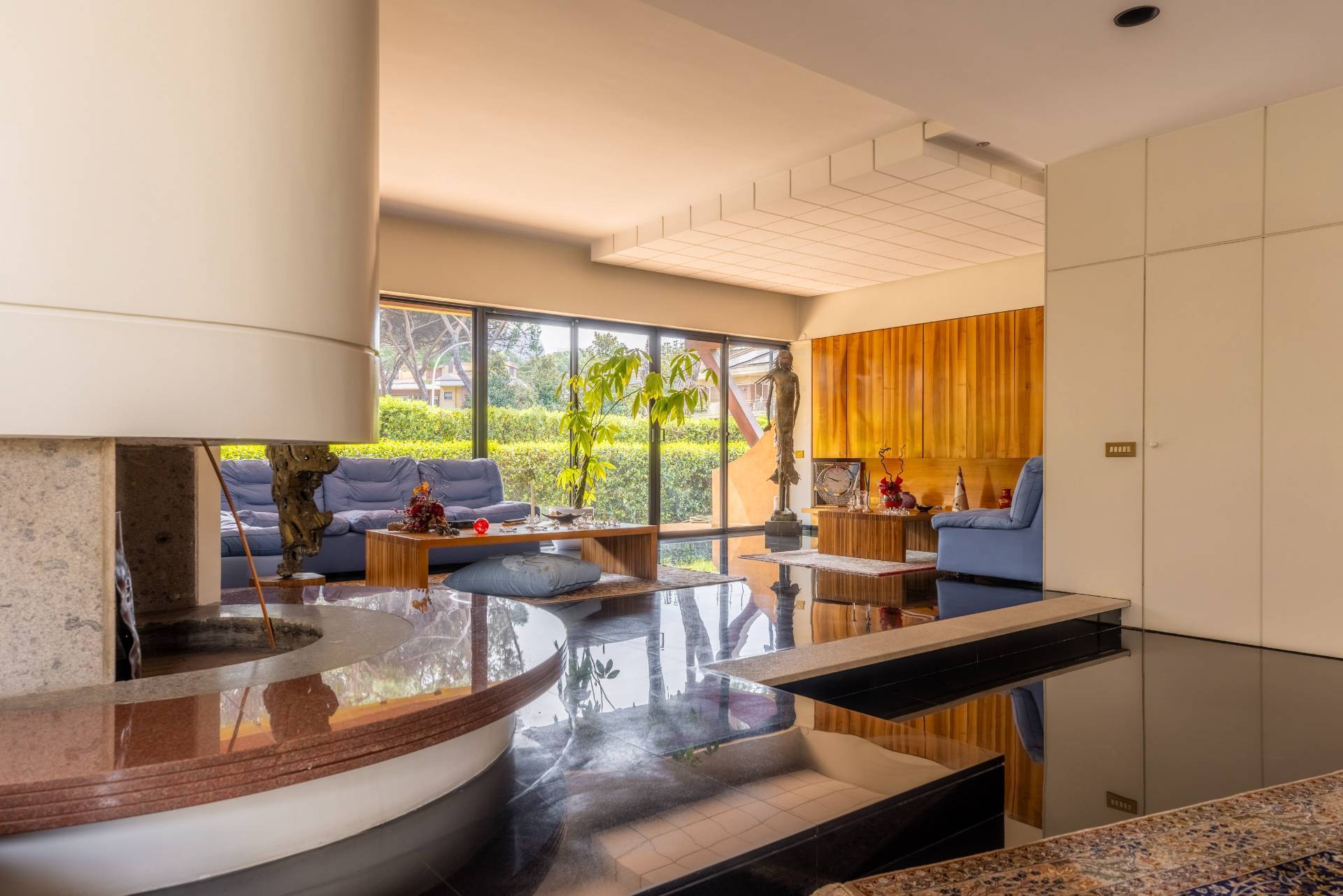 Al primo livello, raggiungibile tramite scala interna o ascensore, si trova il secondo ingresso che affaccia sul secondo salone di rappresentanza con camino e meravigliose vetrate, con vetri blindati, che si aprono sui giardini privati.