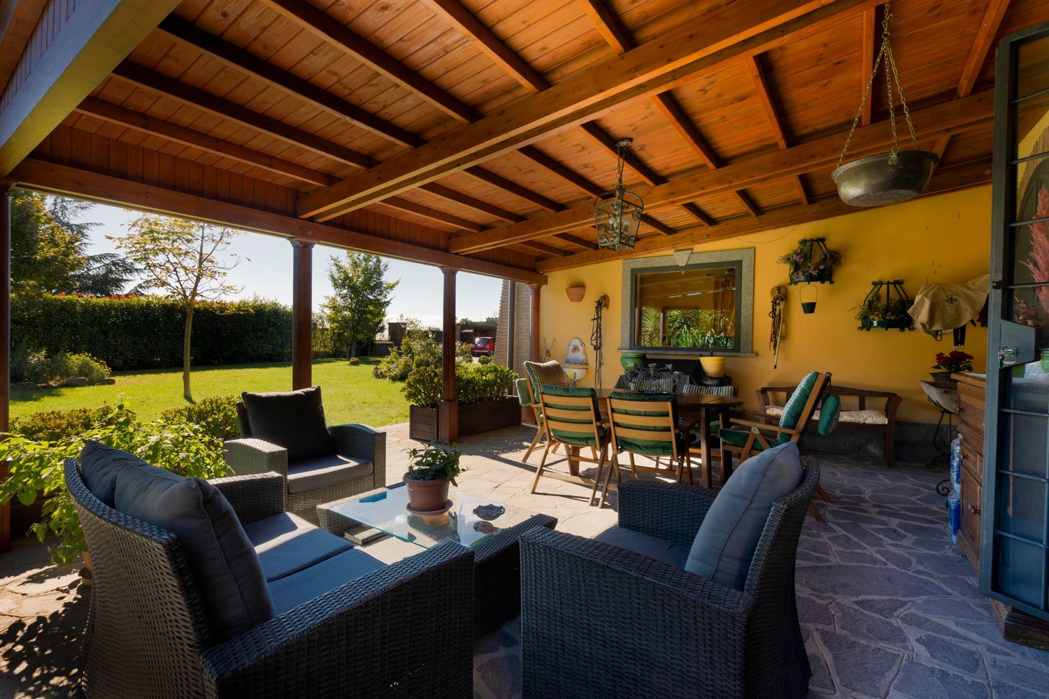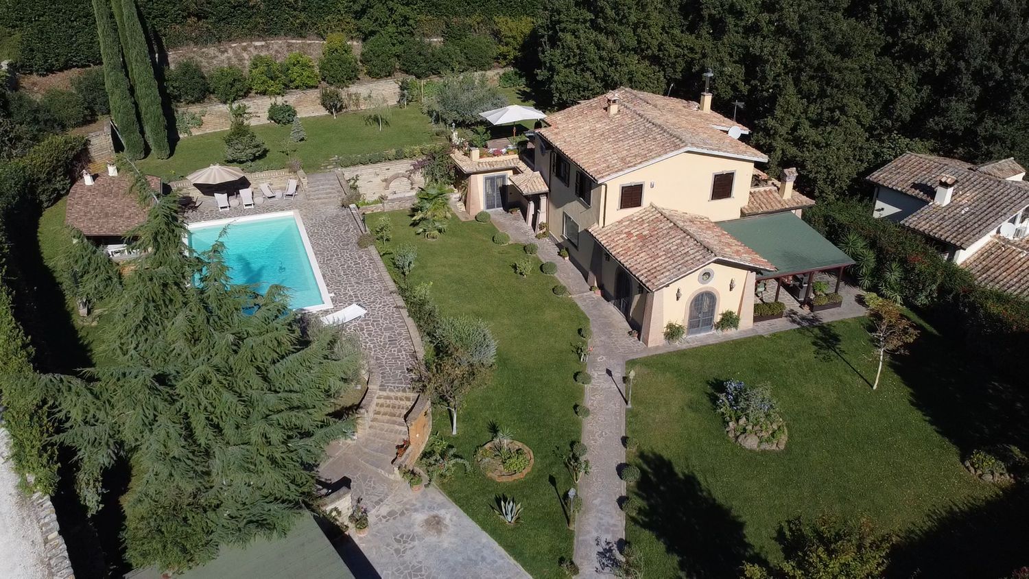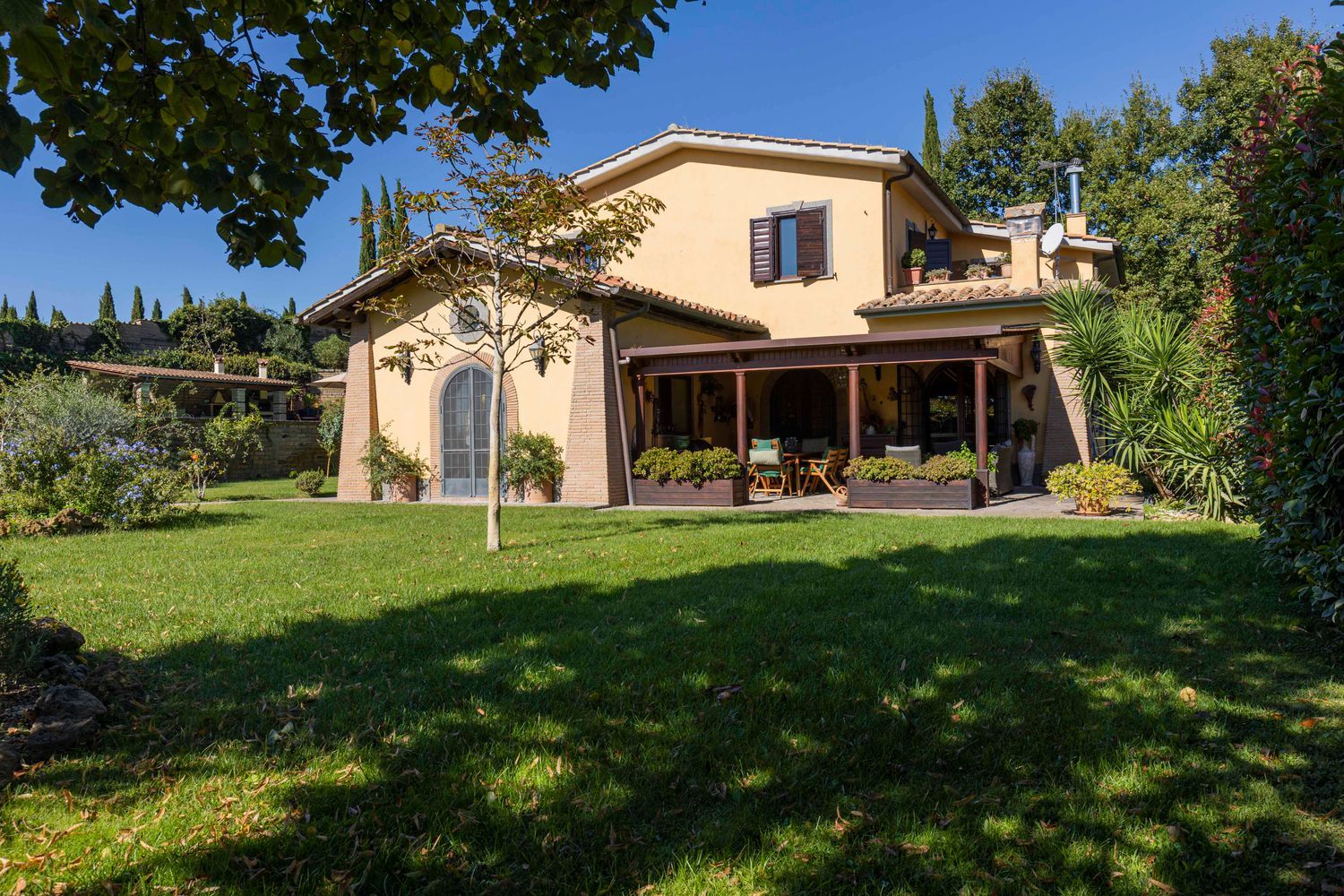 Esternamente troviamo un curatissimo giardino di 3000 mq con grande piscina di 65 mq, patio in legno con cucina esterna con forno a legno, camino e numerose piante ornamentali.