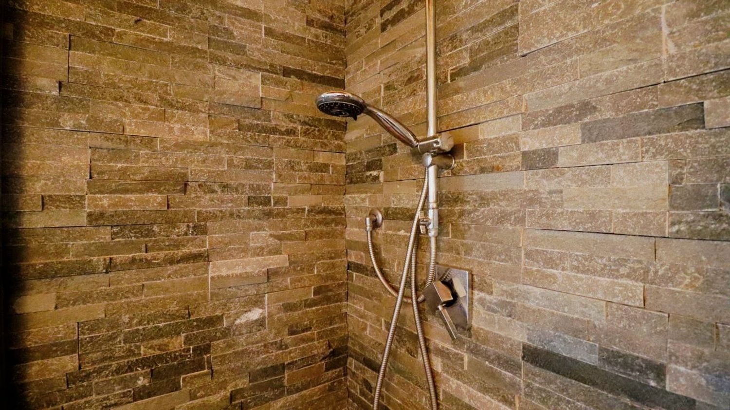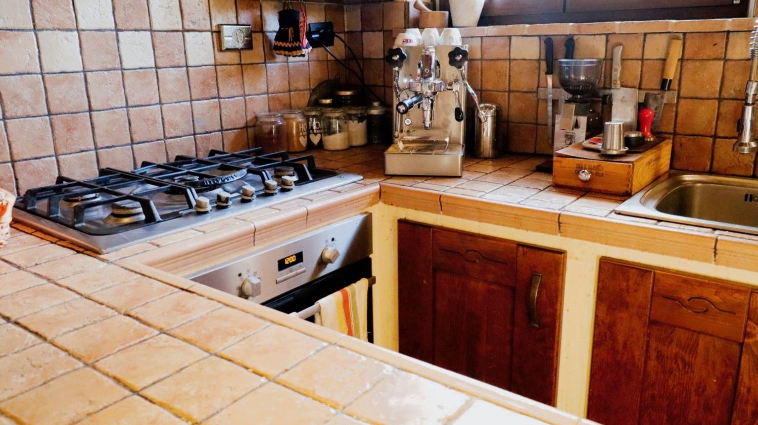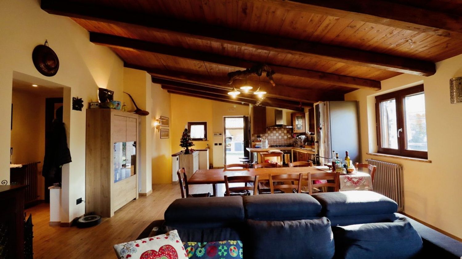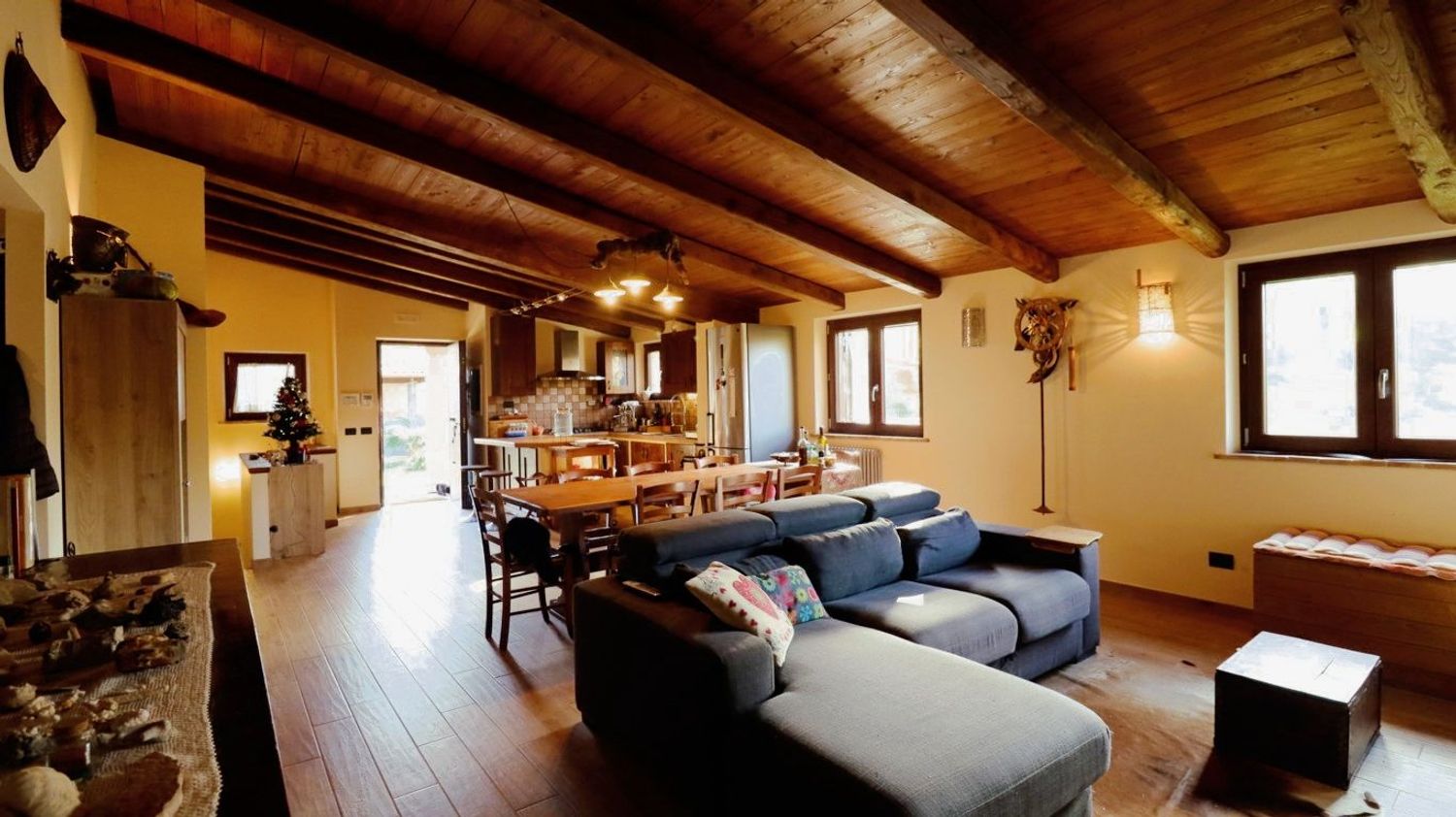 Esternamente sono presenti una tettoria con cucina esterna, un portico con travi a vista e due posti auto coperti.