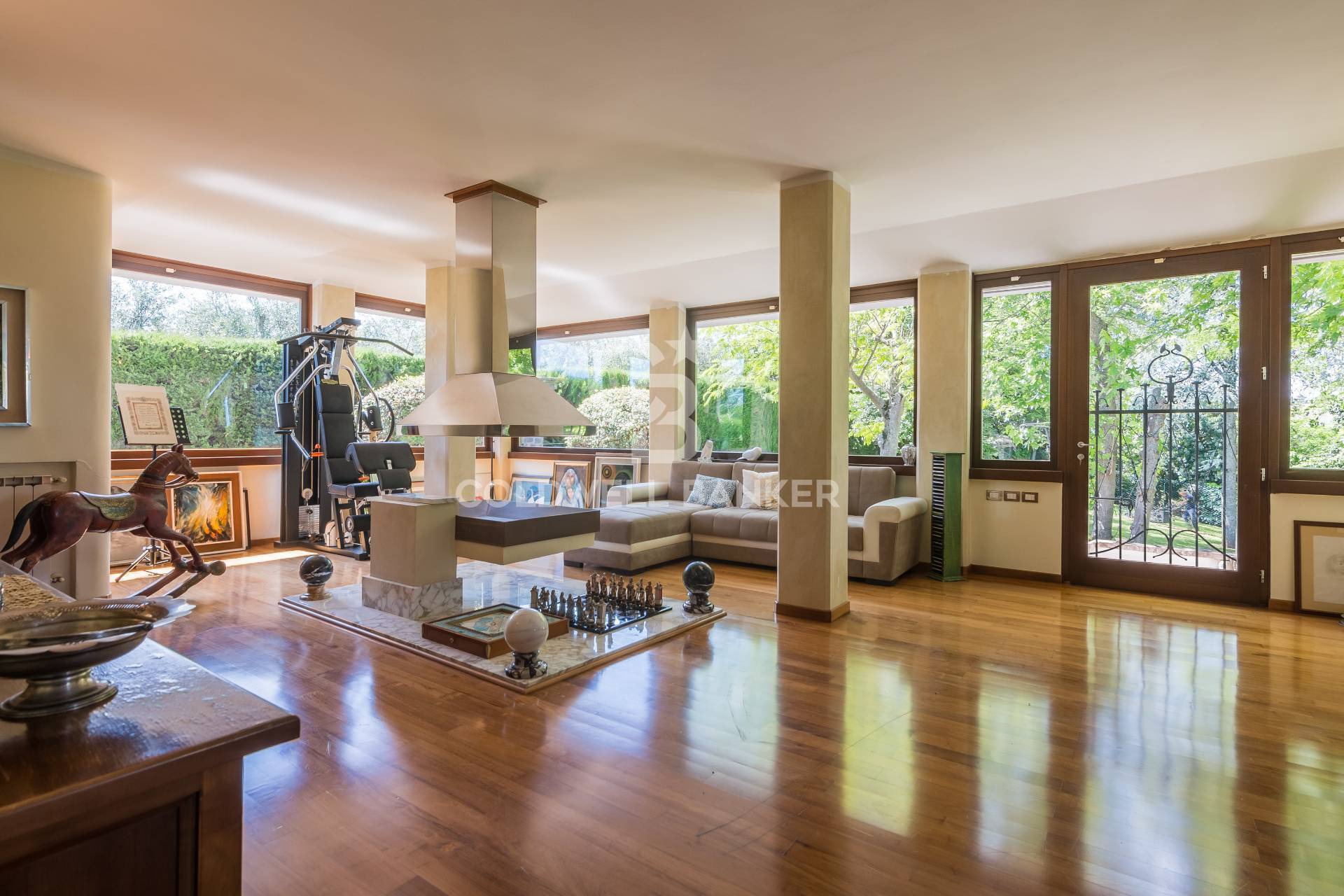 Al piano terra lingresso conduce a un ampio soggiorno con vetrate a tutta parete che donano luce naturale durante tutto il giorno, un camino moderno in acciaio inox, raffinati divani angolari firmati Busnelli e un ambiente dedicato a ufficio o studio.