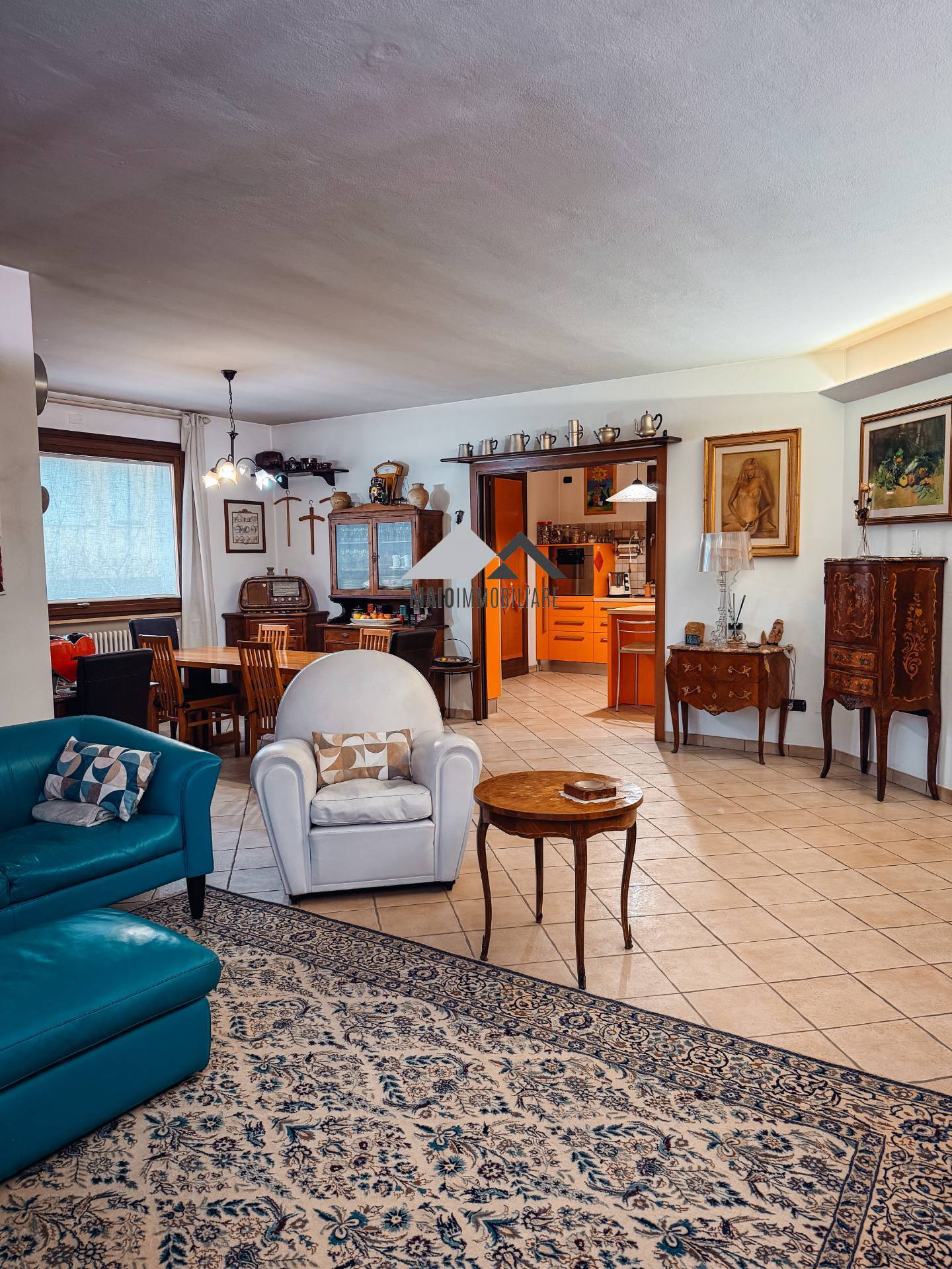 Lingresso principale conduce a un luminoso soggiorno, curato nei dettagli e parzialmente collegato alla zona cucina, creando un ambiente accogliente e conviviale, perfetto per la vita familiare.