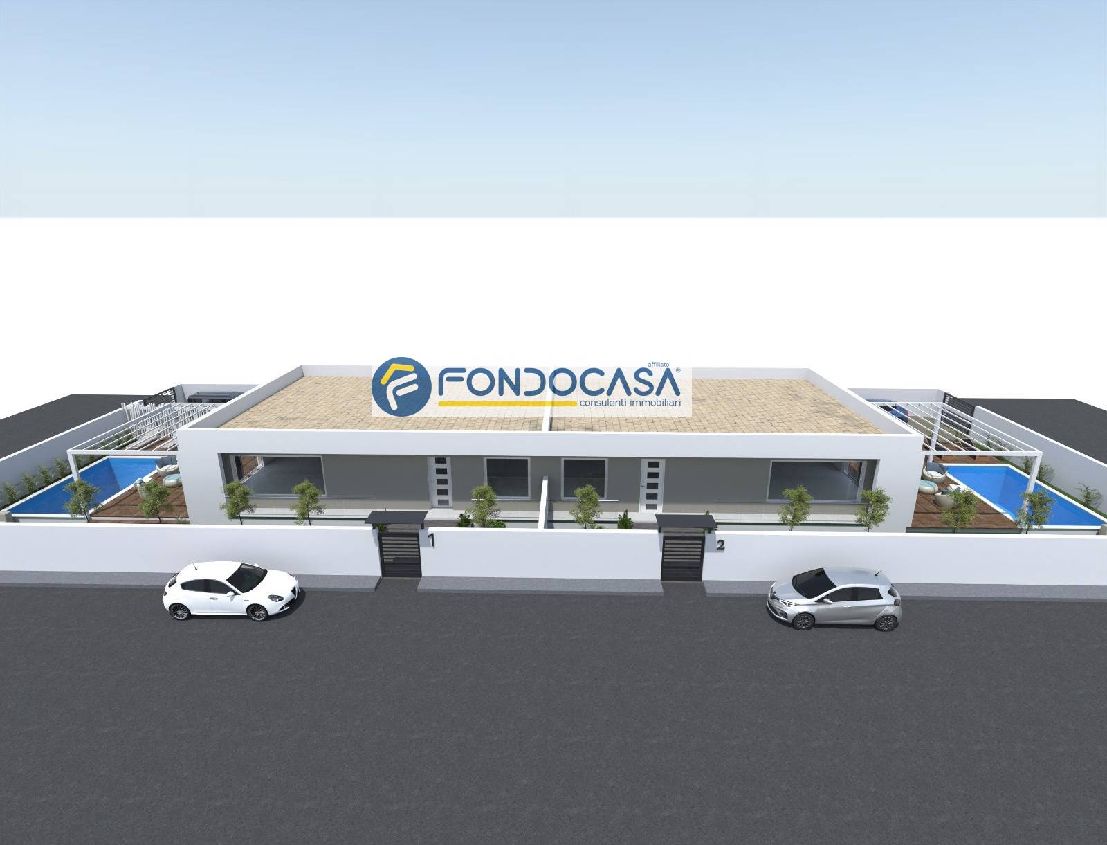 In evidenza sul rendering la disposizione degli spazi interni sar di tre camere da letto, doppi servizi, ampia zona living con angolo cottura, piscina con veranda coperta e spazio retrostante la casa con accesso di servizio con posto auto. La casa circondata da giardino.