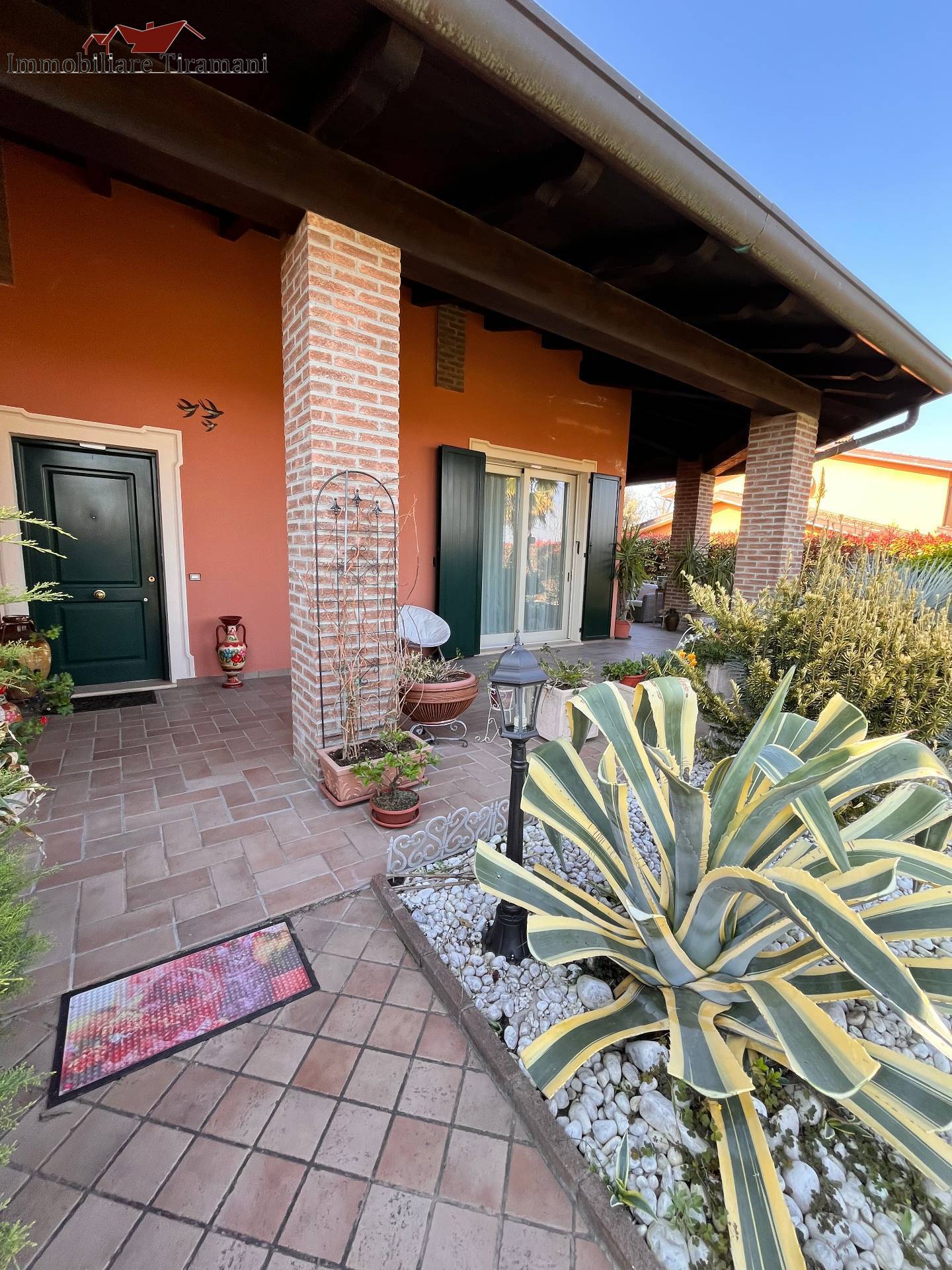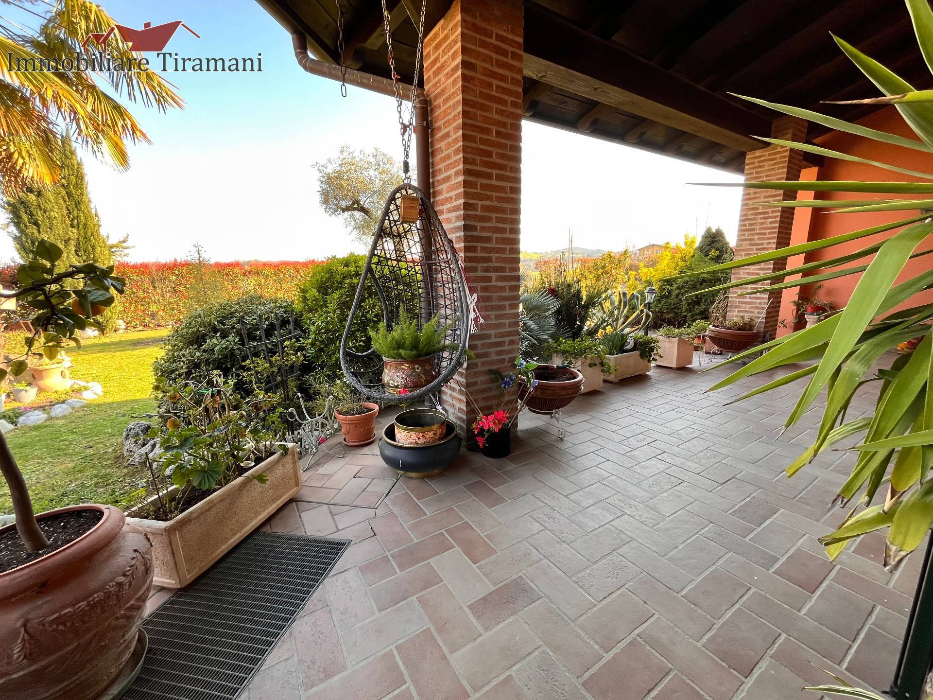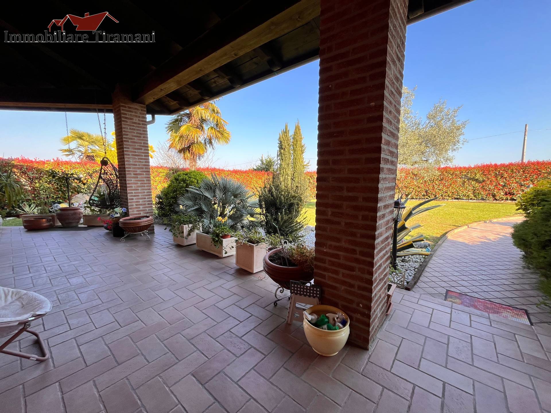 Circondata da uno splendido giardino completamente recintato e piantumato, tramite un portico accediamo alla parte abitativa con stanze luminose ed ampie.