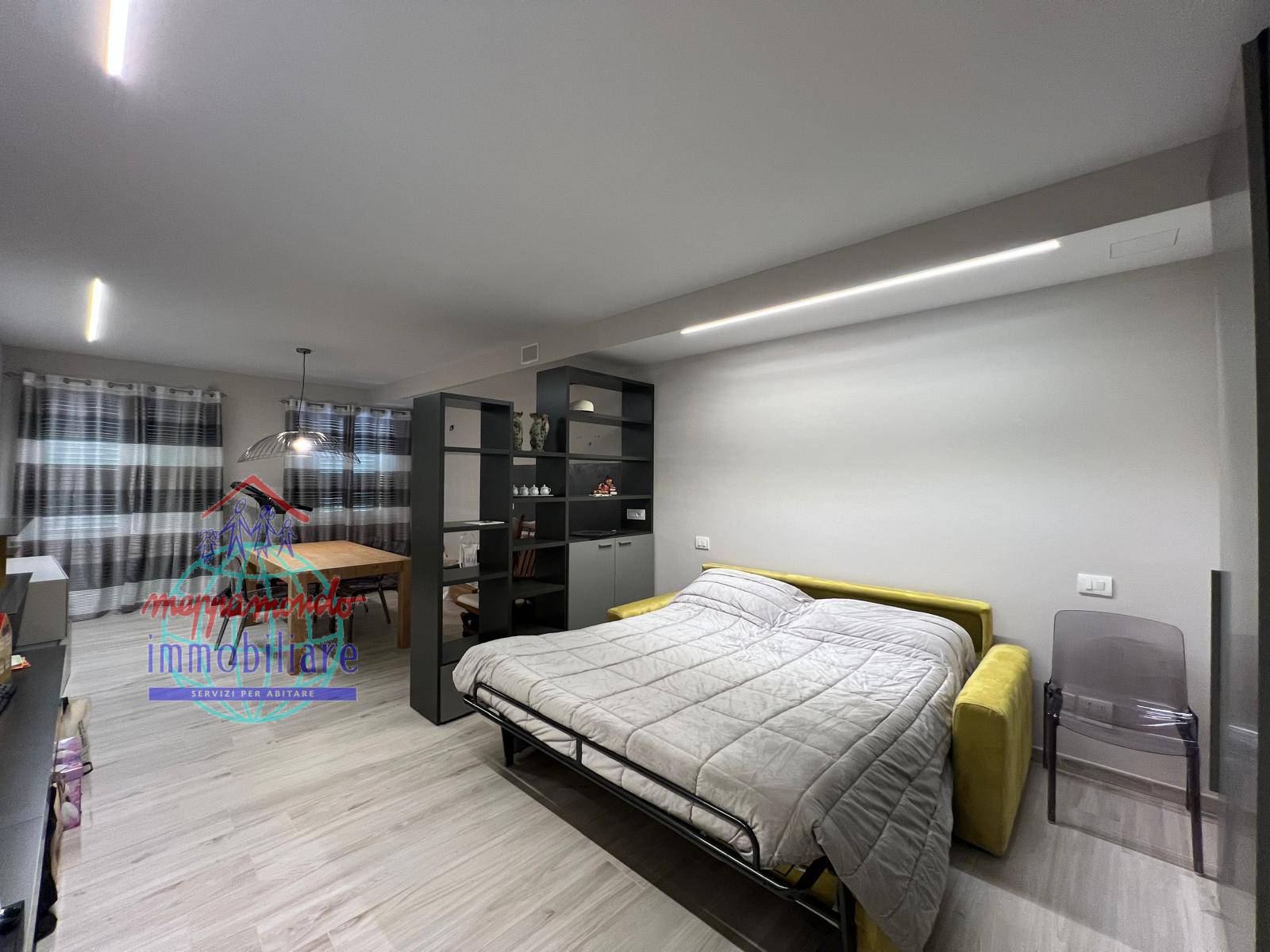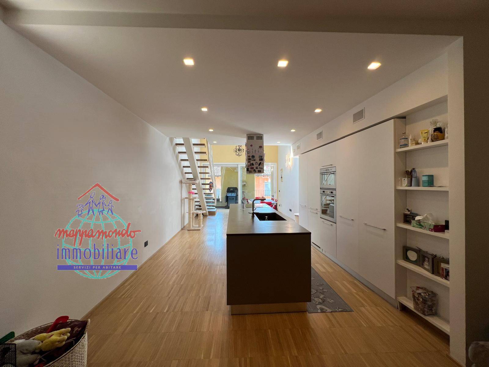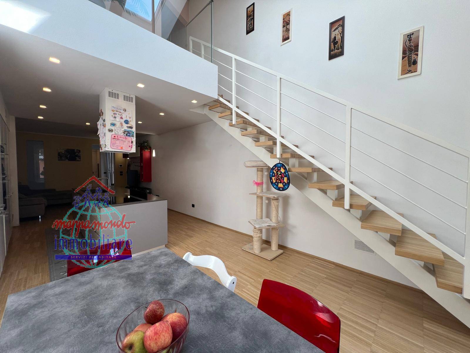 La disposizione degli spazi ottimale, cosi suddivisi: piano terra: ingresso, garage doppio automatizzato, lavanderia, ripostiglio, vano tecnico/cantina; piano primo: ampio soggiorno con angolo cottura, balcone, camera matrimoniale, ripostiglio e bagno con doccia; piano secondo : ampio soggiorno con angolo cottura, balcone, camera/studio, bagno con doccia e sanitari sospesi e scala arredo; piano terzo: ampio bagno con vasca e doccia, 2 camere di cui una con balcone.