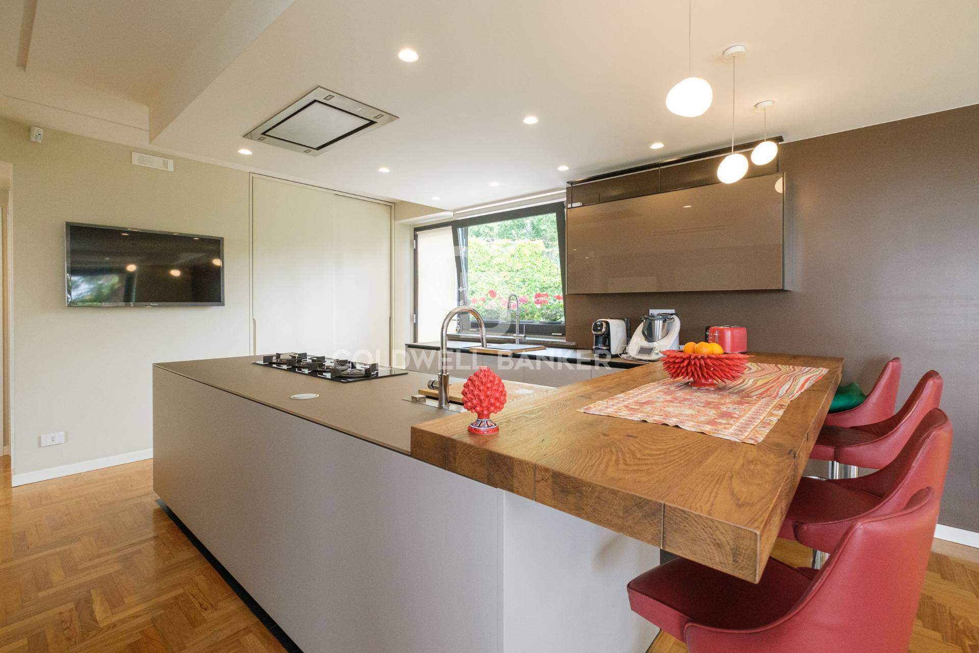 L'ingresso si apre su una scenografica zona giorno in open space: un ambiente di alta rappresentanza dove i volumi fluidi definiscono diverse aree living, una sala da pranzo formale e una cucina di design.