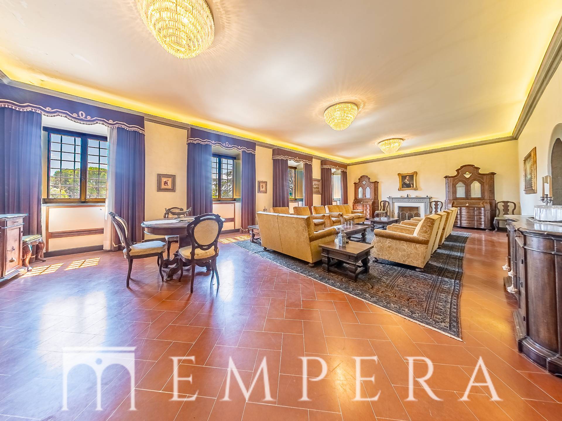 Interni: 33 vani luminosi e 8 bagni, perfettamente ristrutturati con finiture di pregio e arredi raffinati.