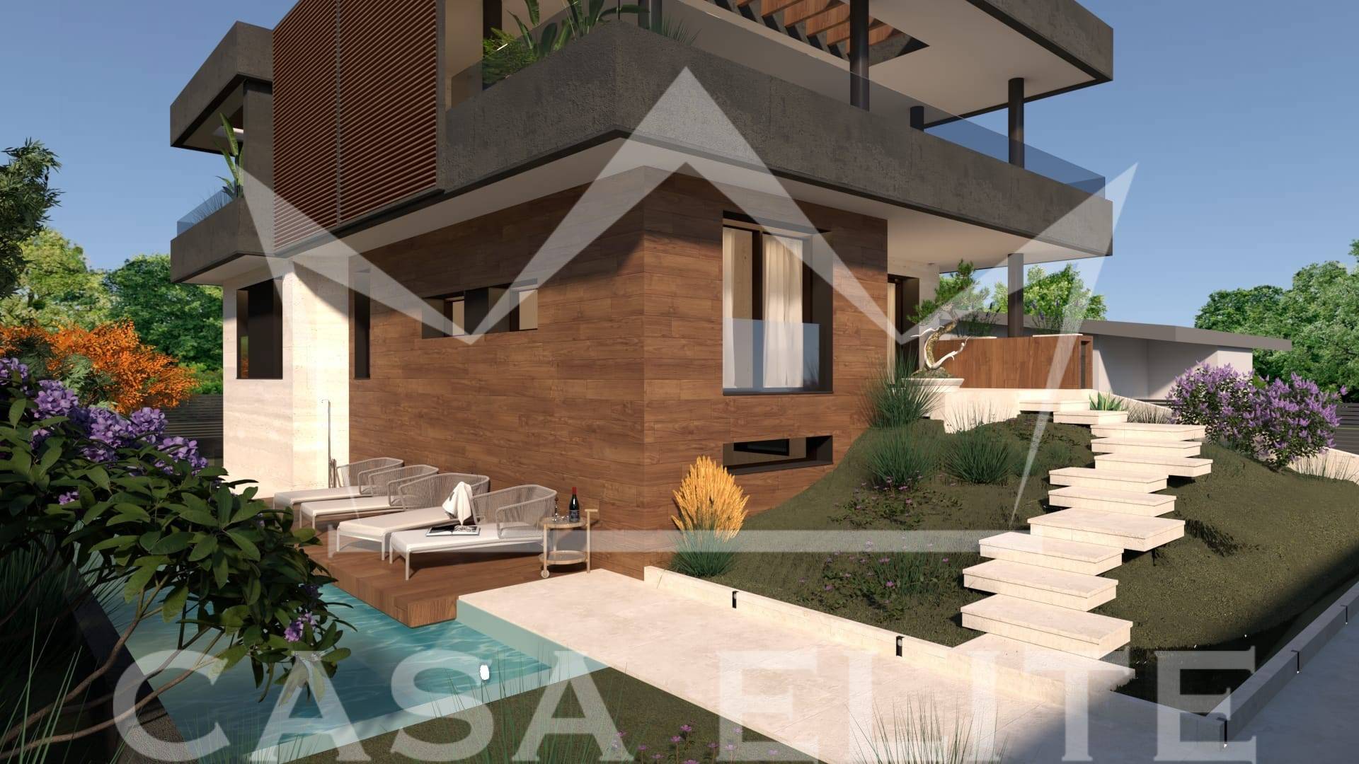 ° Giardino di 400 mq con possibilit di realizzare una piscina fino a 13 metri, due posti auto scoperti e la possibilit di ricavare ulteriori 3 posti auto metanizzati al piano interrato.