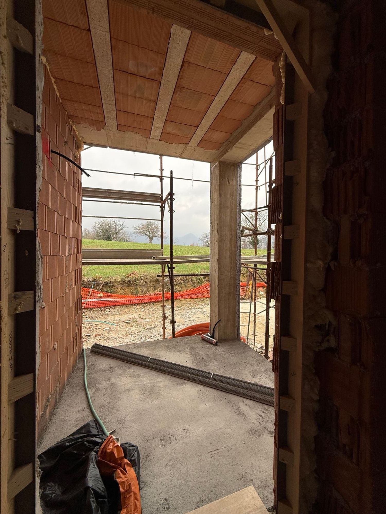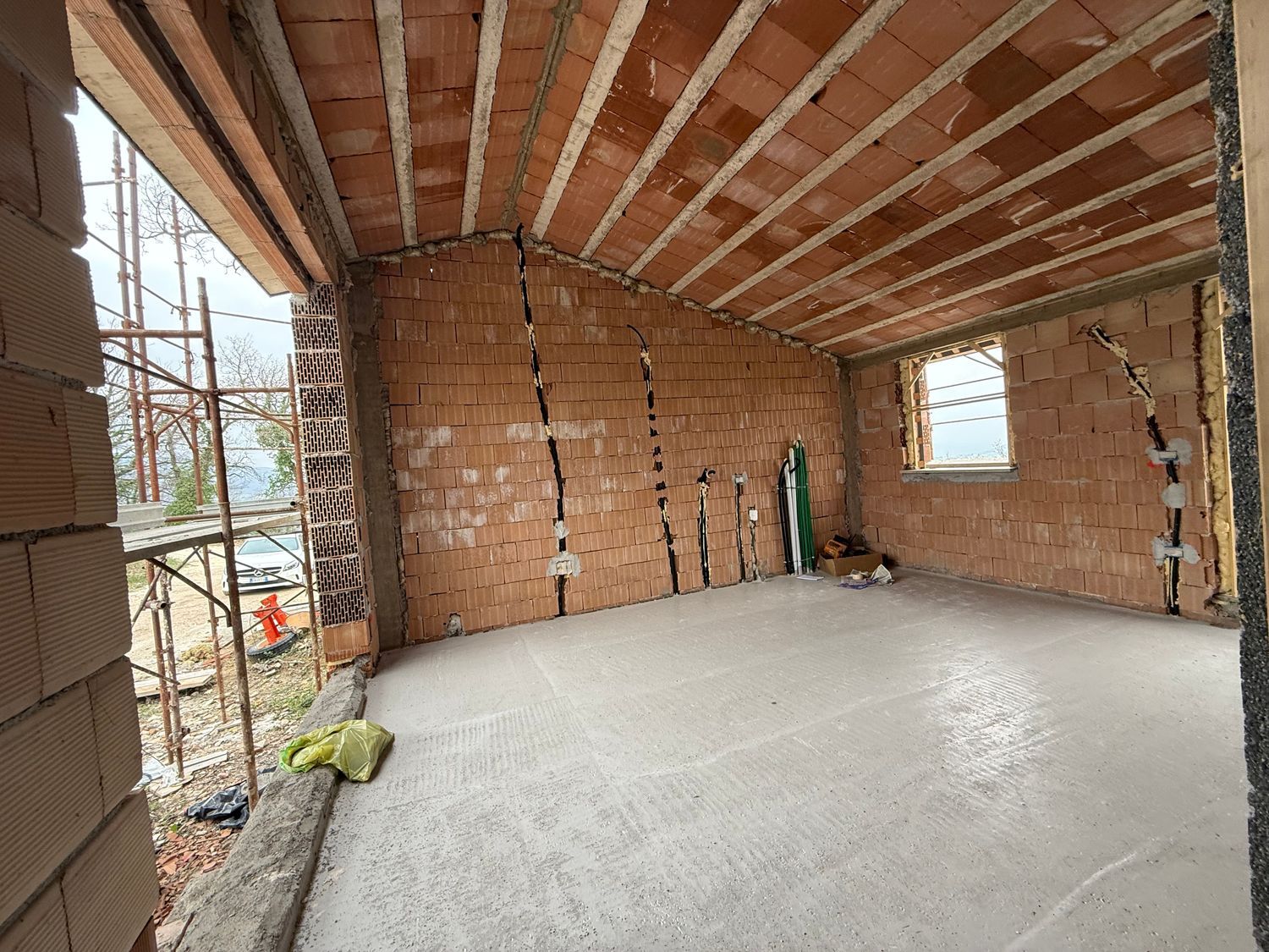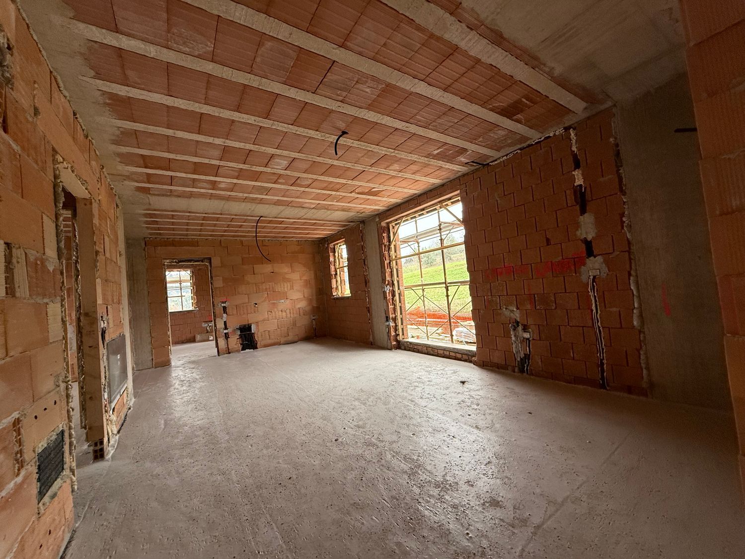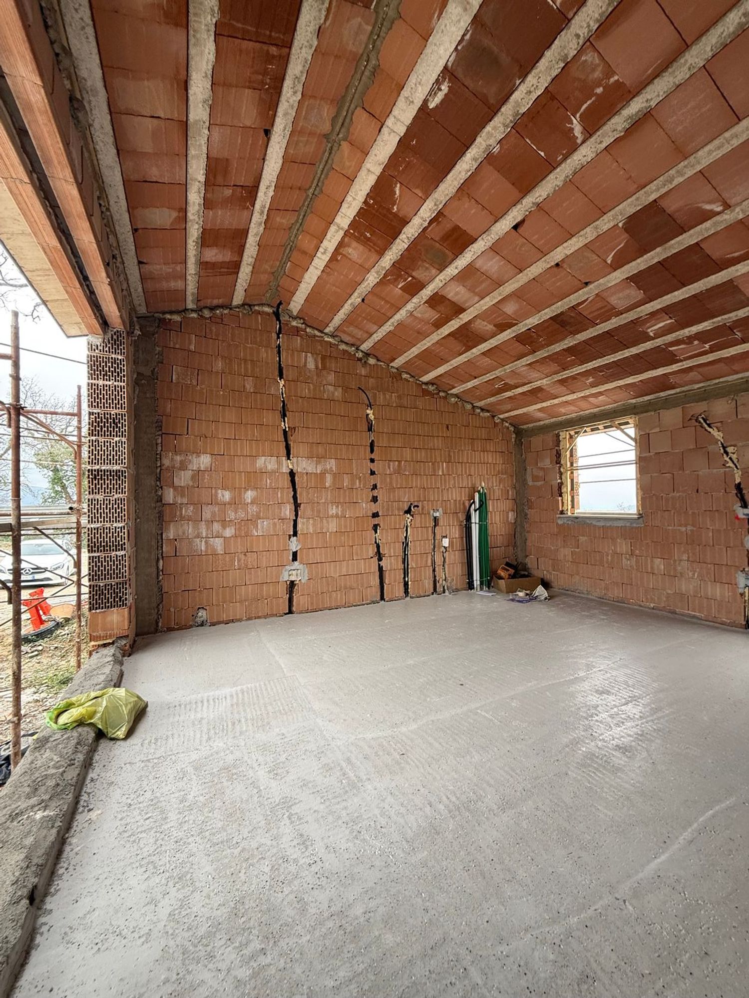 La villa, attualmente in fase di costruzione, presenta lavori in corso che includono carpenteria, tamponature interne ed esterne e un tetto gi completato.