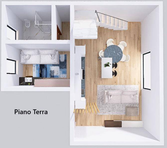 Il piano terra caratterizzato anche dalla presenza di disimpegno, bagno e altro locale che ad oggi stato concepito come camera/studio per venire incontro alle esigenze di tante persone che cercano uno spazio all'interno della casa per crearsi il proprio ufficio al fine di lavorare in smart working oppure pu essere trasformata in locale cucina utilizzando l'altra stanza come soggiorno.