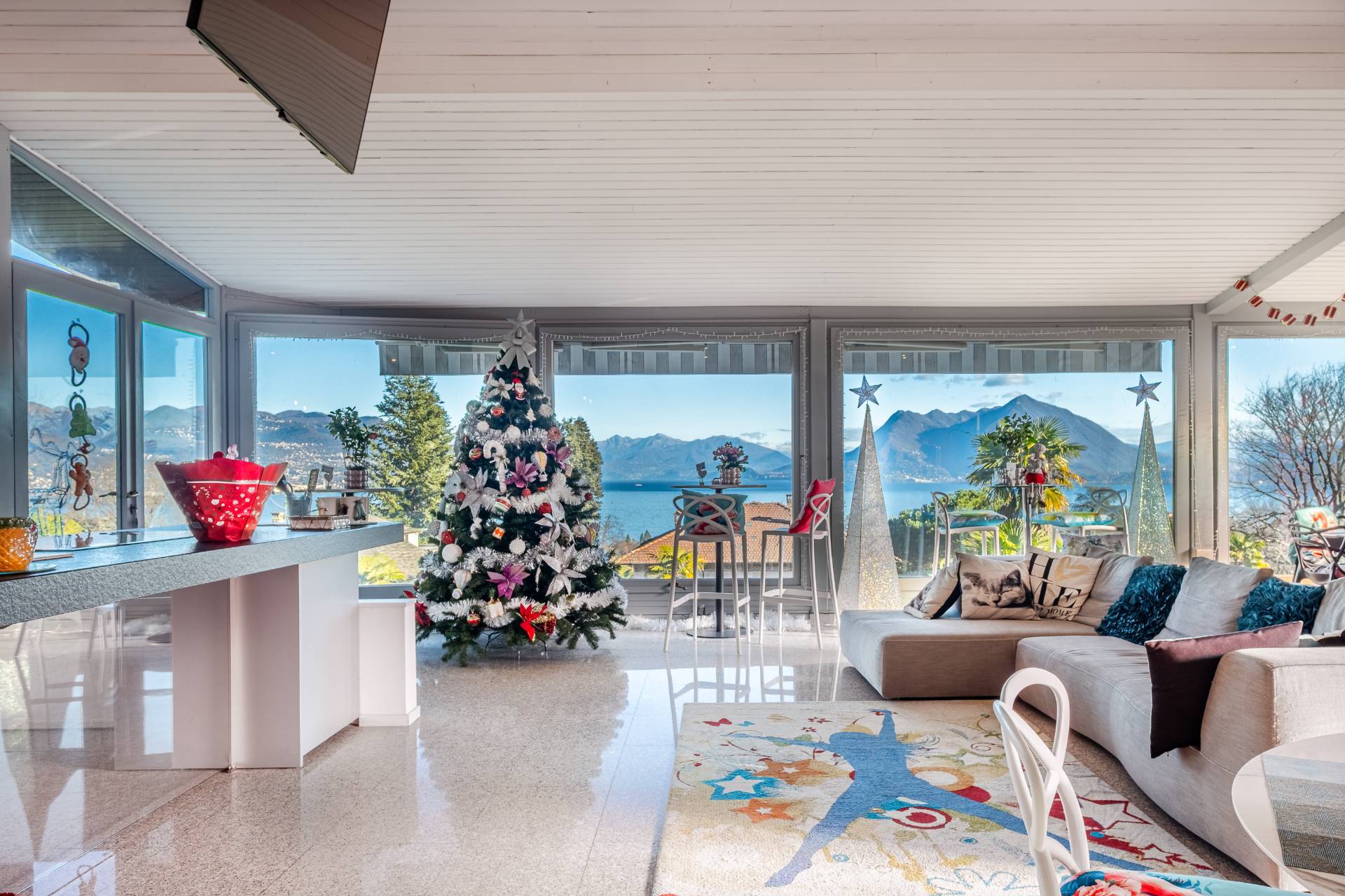 Primo piano: dominato da un meraviglioso salone di circa 130 mq, con camino e grandi vetrate panoramiche che si aprono sul Lago Maggiore e sullIsola Bella.