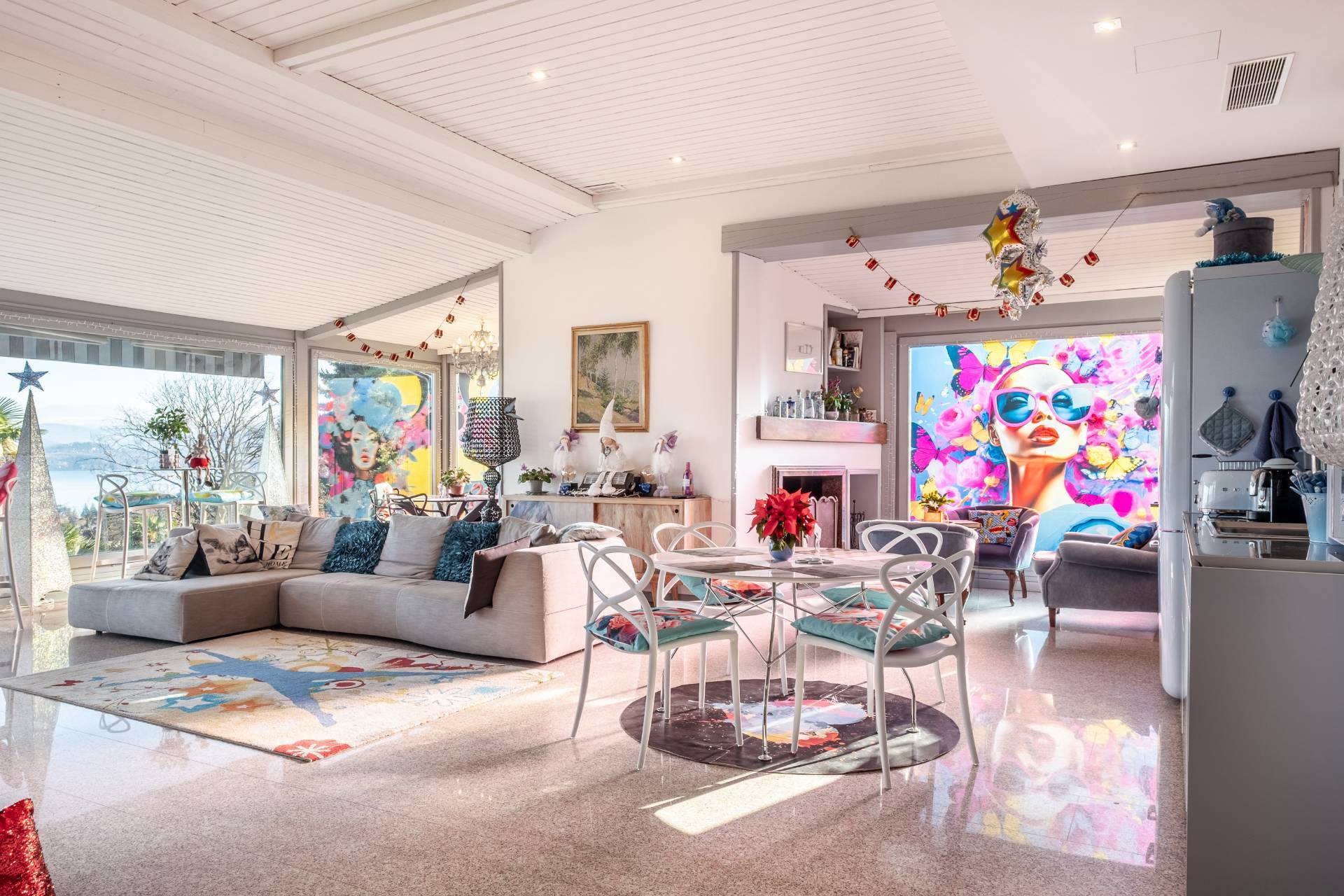 La villa si distingue per la sua architettura moderna e per gli ampi spazi luminosi che si affacciano sul lago. Limmobile si sviluppa su tre livelli e attualmente ospita unattivit di Bed & Breakfast ai piani inferiori, mentre lultimo piano dedicato ad uso abitativo.