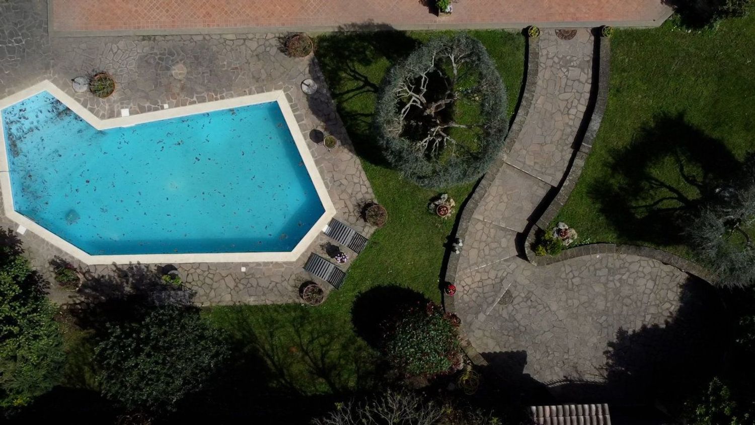 Esternamente la villa circondata da un curatissimo giardino di circa 1000 metri quadrati, in parte a prato e in parte pavimentato nel quale sono presenti numerose piante ornamentali, ulivi e una piscina di 60 metri quadrati.
