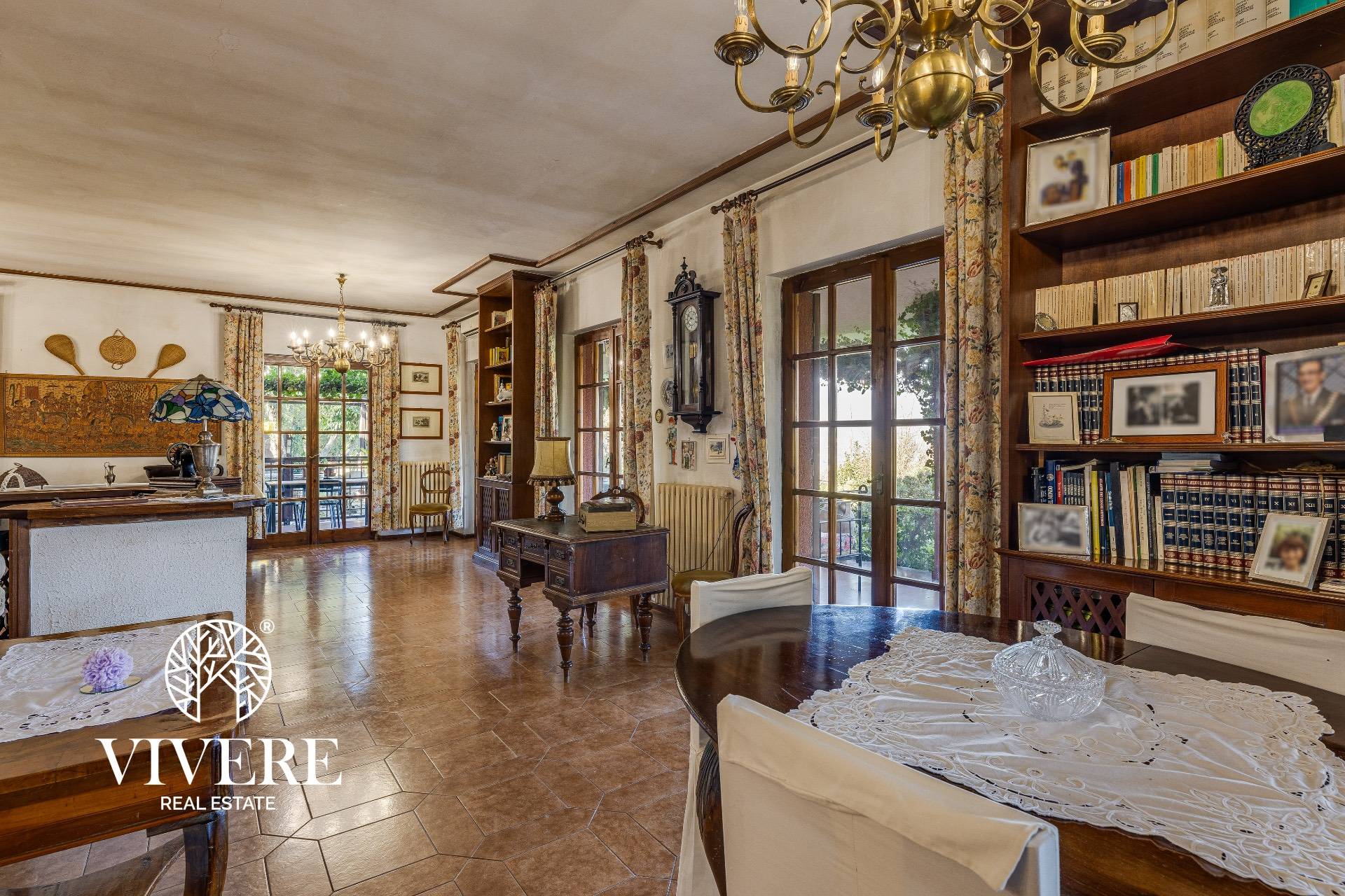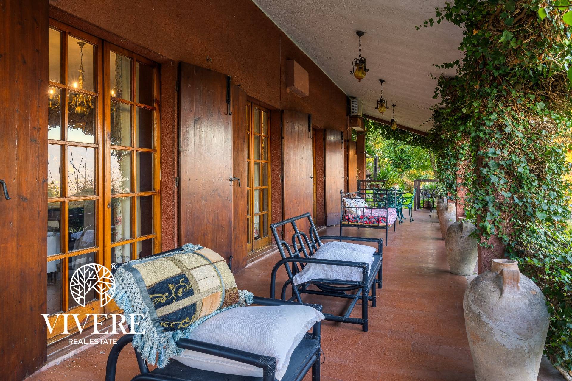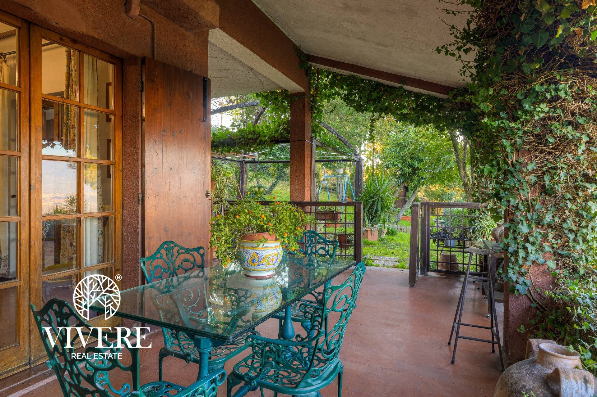 L'immobile si struttura su due livelli fuori terra con un bellissimo portico, dove si pu godere di una meraviglia vista panoramica sulla citt, ed circondata da un giardino perimetrale di c.a. 3560 mq con annesso terreno di c.a 2260 mq. Internamente si compone al piano terra da un ampio salone triplo con un maestoso camino, cucina abitabile con annessa dispensa, Due camere, quattro servizi e una zona lavanderia.