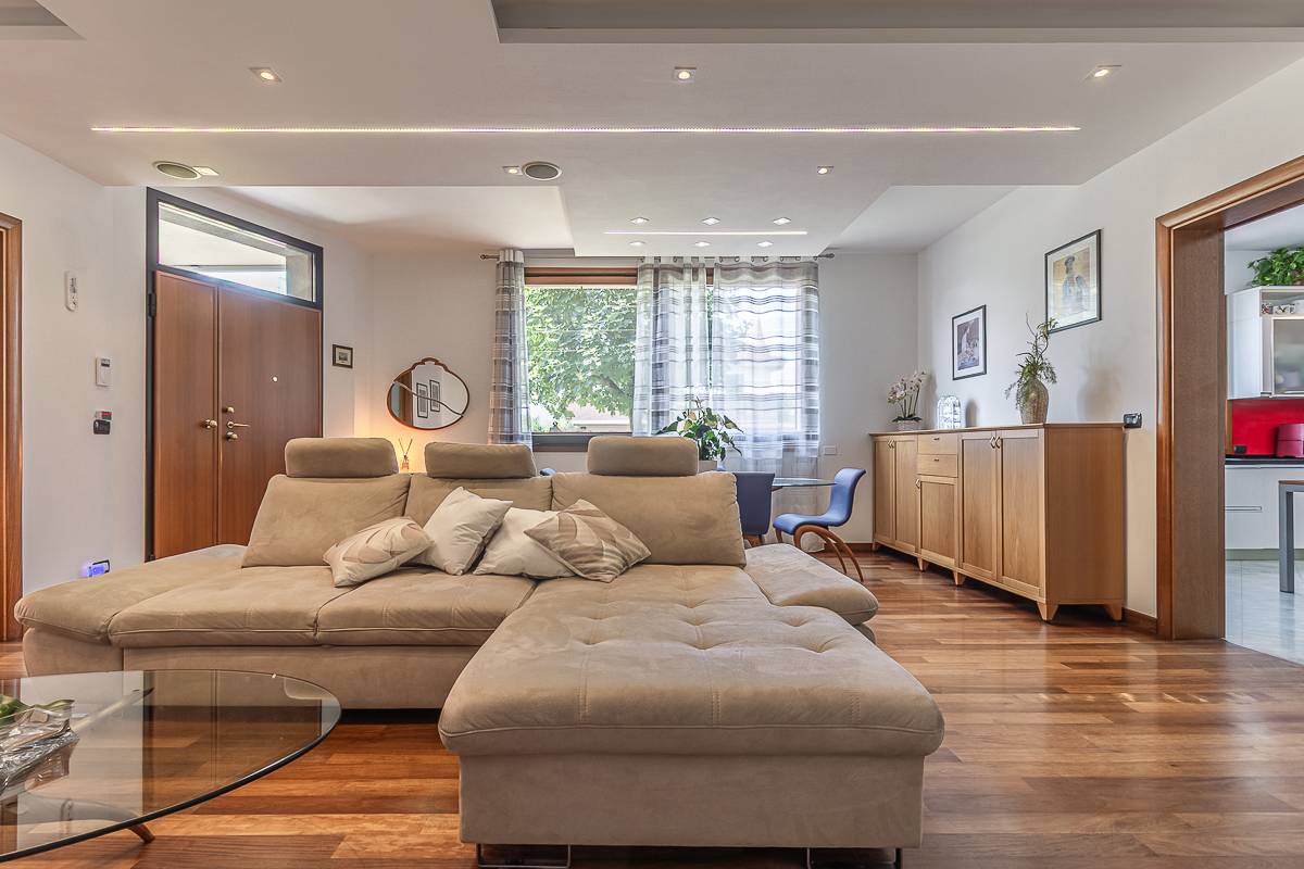 A seguire troviamo una cucina abitabile con comodo ripostiglio e un secondo accesso che porta alla scala interna e al garage di circa 31 mq. La zona notte si compone di due camere da letto, un bagno padronale, un secondo bagno/lavanderia, un ripostiglio e uno studio adiacente al soggiorno.
