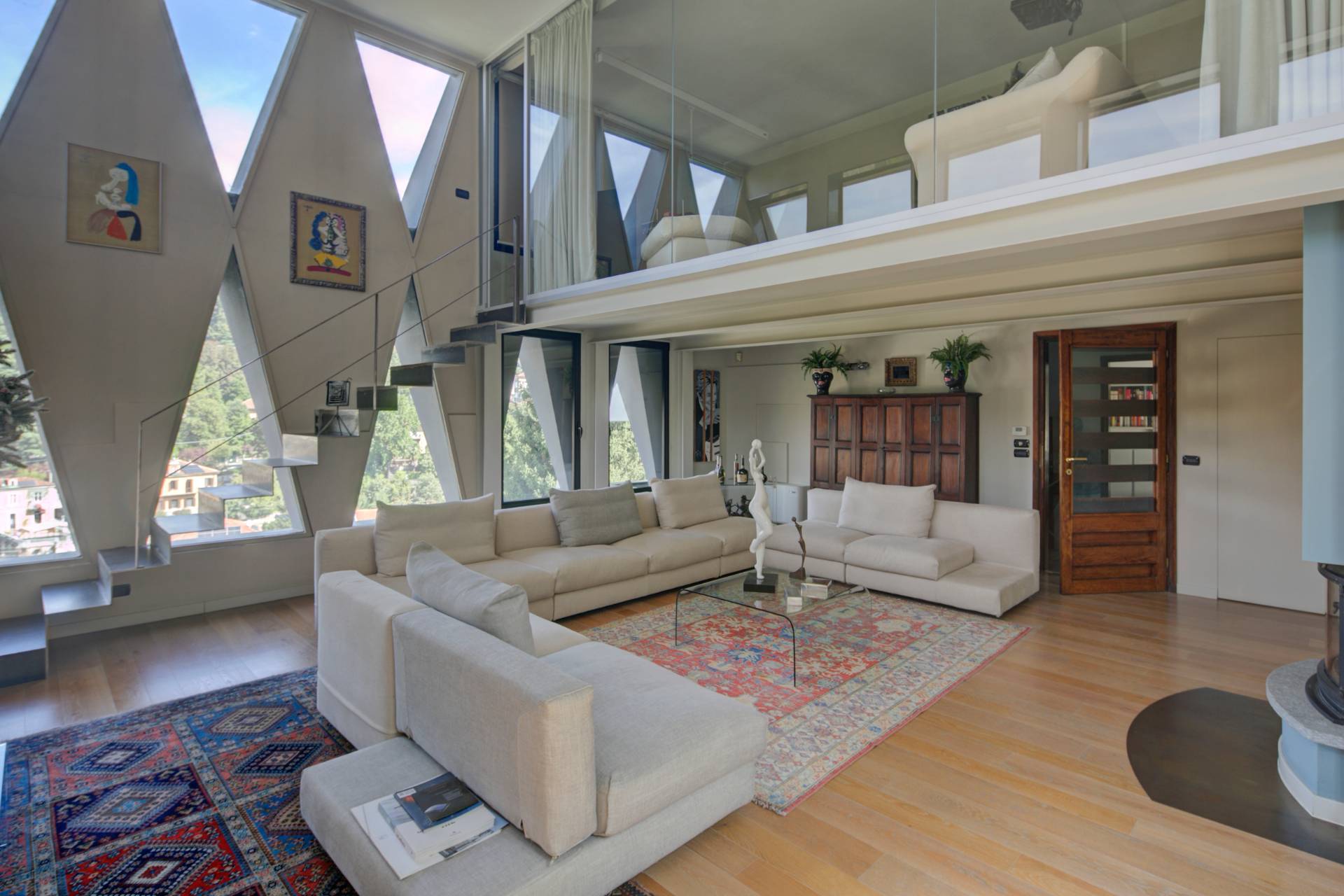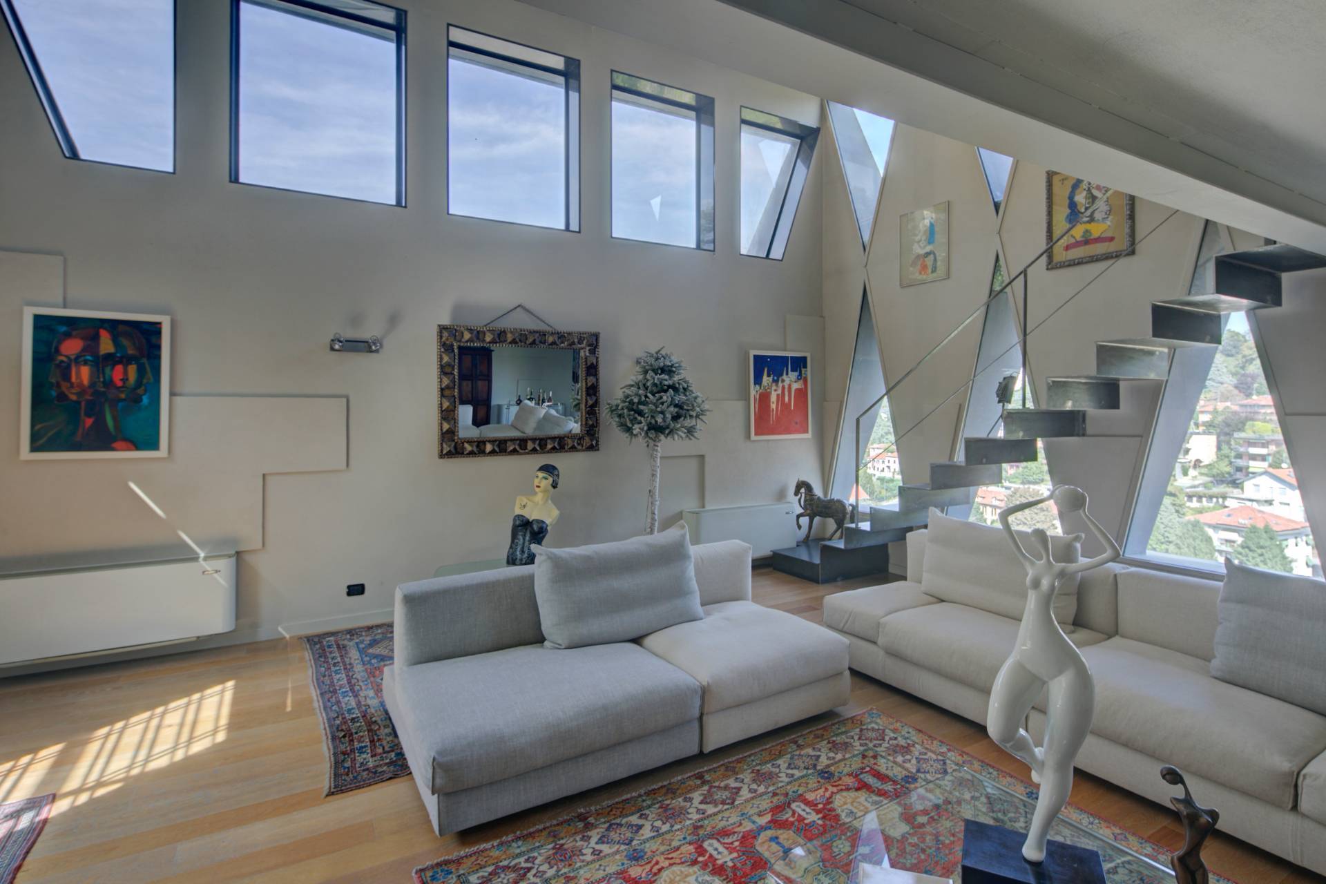 L'ultimo piano accoglie un grande salone a doppia altezza caratterizzato da originali finestre triangolari e che si articola intorno a un caldo camino; una scala ci porta nella sala della musica e televisione posta in un soppalco chiuso da cristalli e con splendida vista sulla citt;di fronte al solone uno studio e un bagno per gli ospiti.