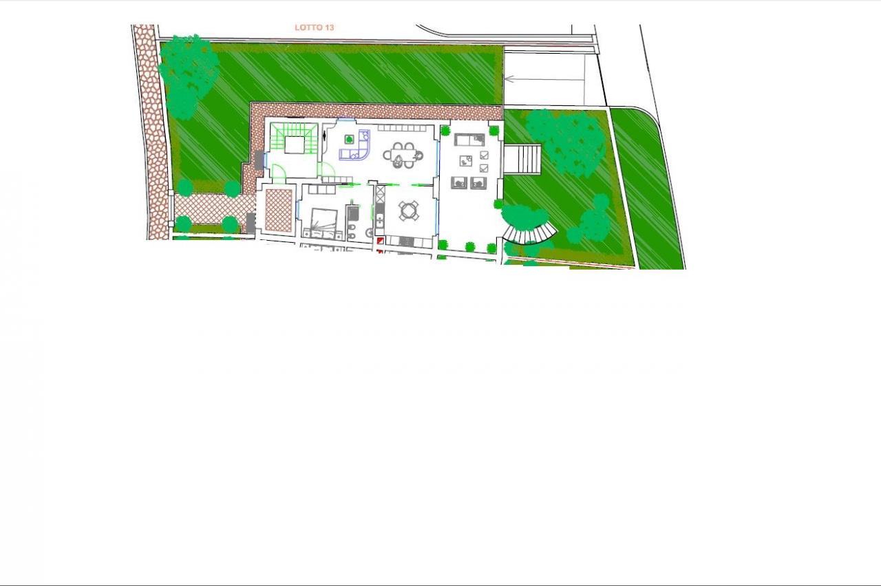 Zona giorno al piano terra composta da ingresso su ampio soggiorno, cucina abitabile, camera da letto matrimoniale di 14 mq circa con annesso bagno con box doccia, corte esterna composta da ampio giardino, superficie pavimentata, portici e logge per complessivi 329 mq circa.