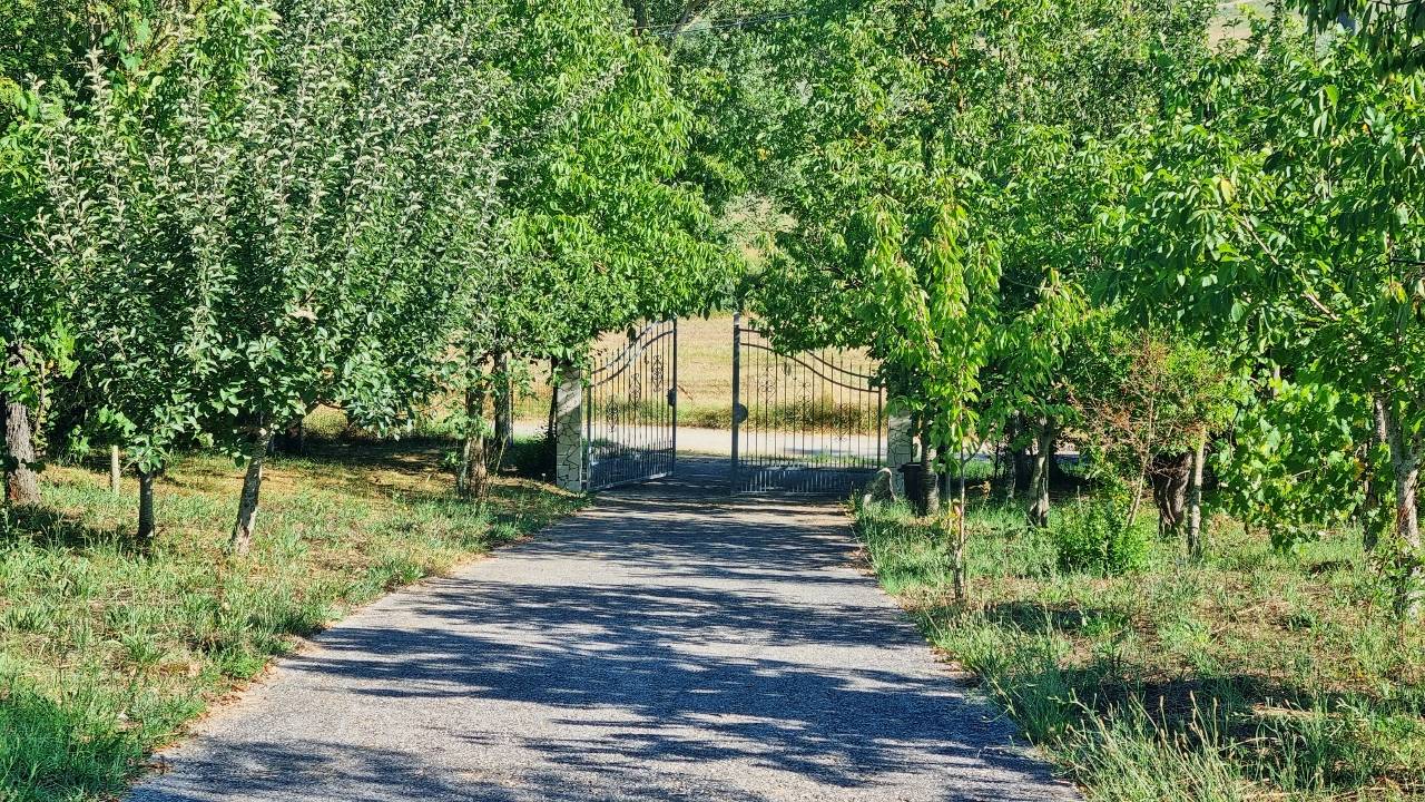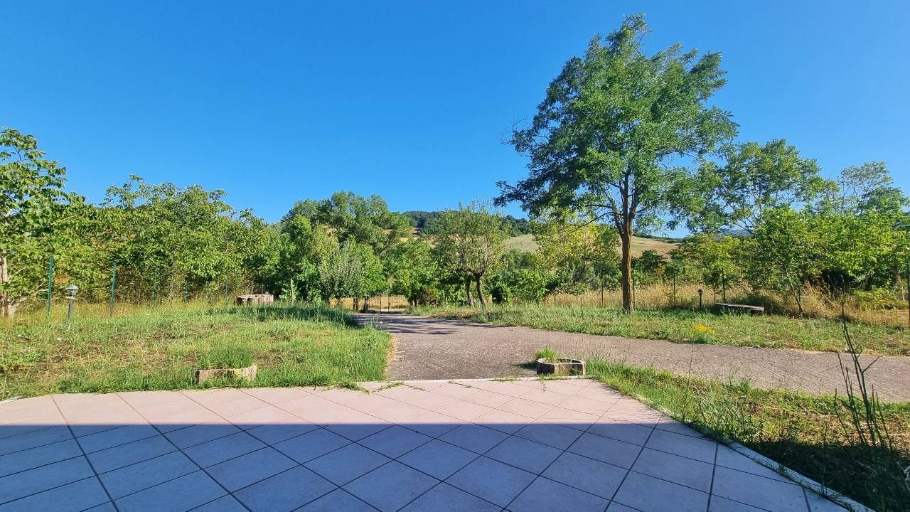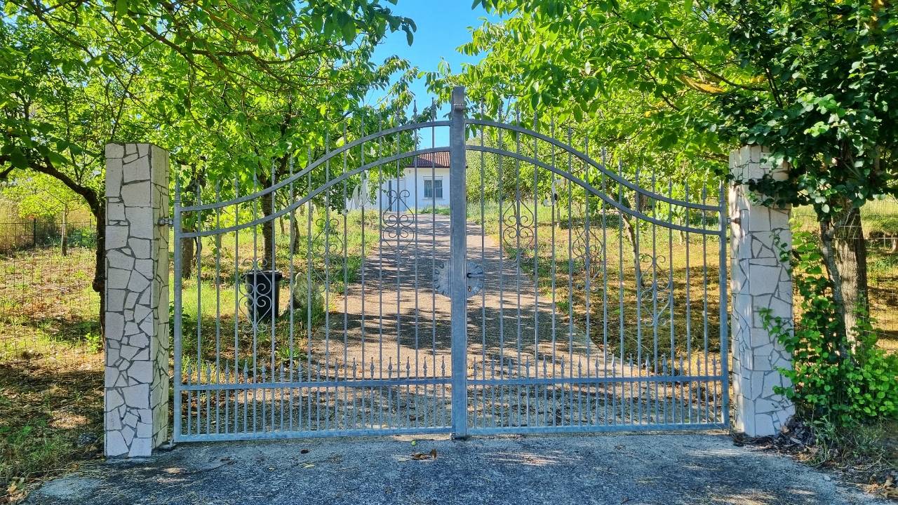 La villa in vendita comprende un accesso carrabile dalla strada, un giardino coltivato con alberi di ciliegio, noci e vitigno autoctono, un vialetto che dal cancello esterno in ferro battuto conduce a un piccolo patio.