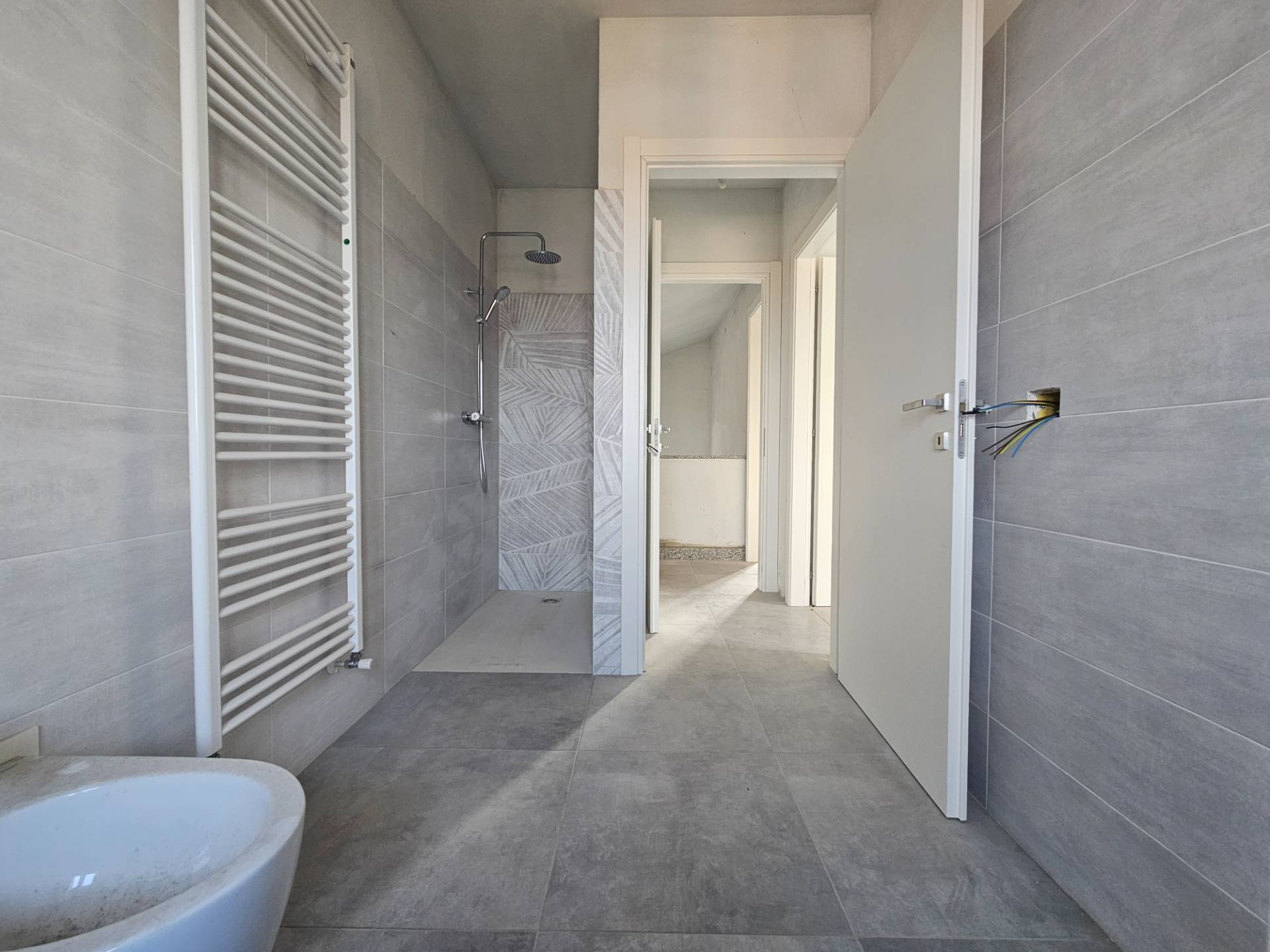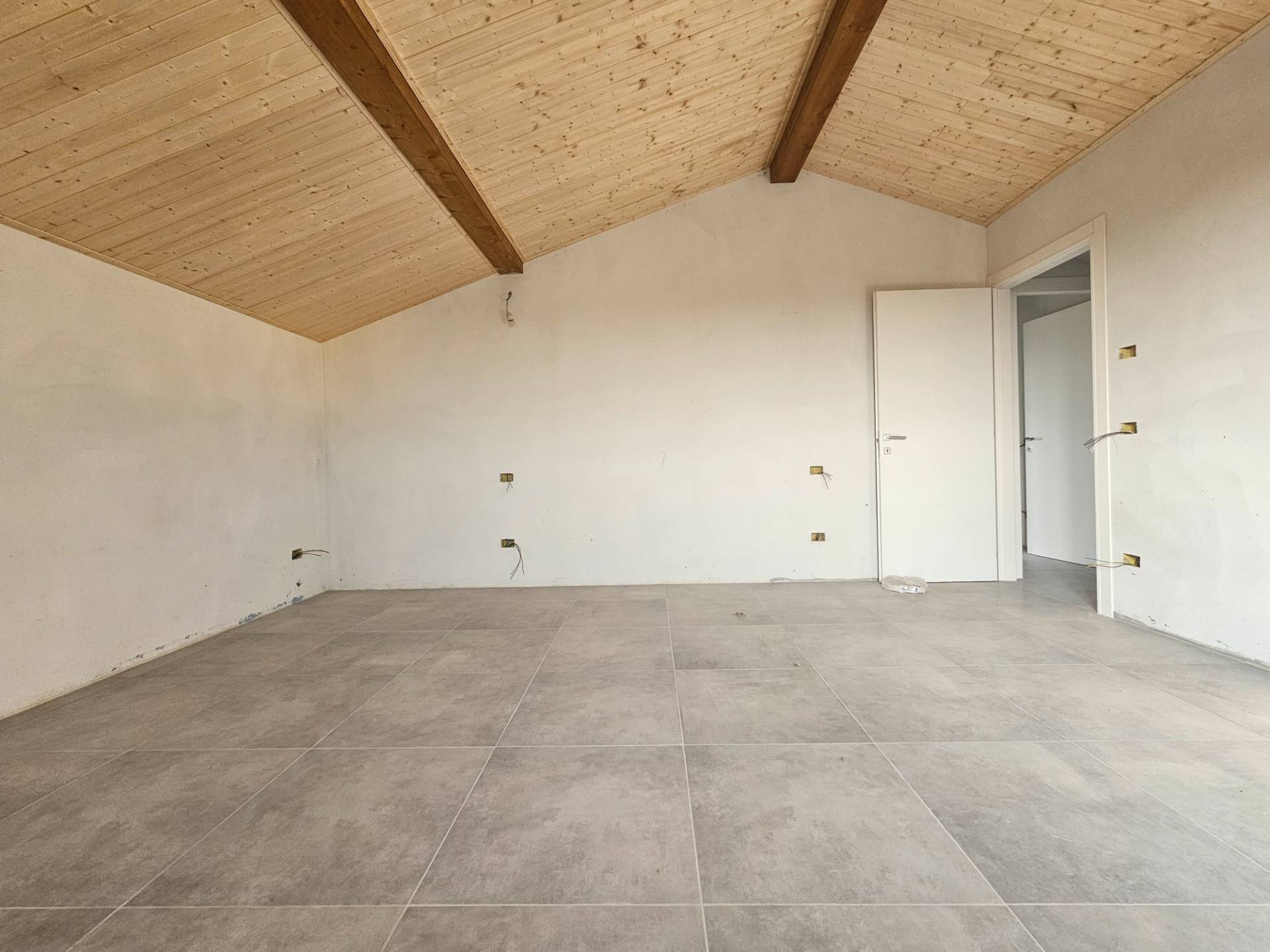 L'ingresso al piano rialzato diretto sulla zona giorno, attualmente suddivisa in cucina abitabile e soggiorno, con possibilit di creare un'unica zona open space con un doppio affaccio sul giardino privato, accessibile da un lato dal porticato coperto, dall'altro dallo spazioso terrazzo di circa 40 mq. Il piano terra completato da una prima camera/locale accessorio di 18 mq dal bagno con doccia.