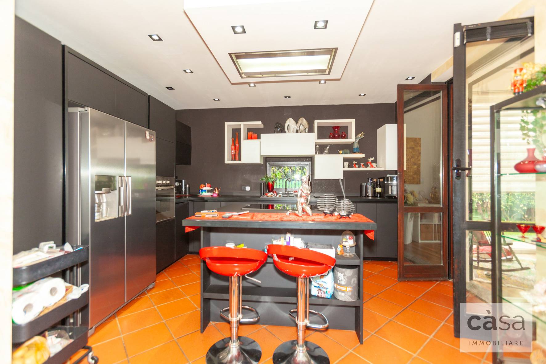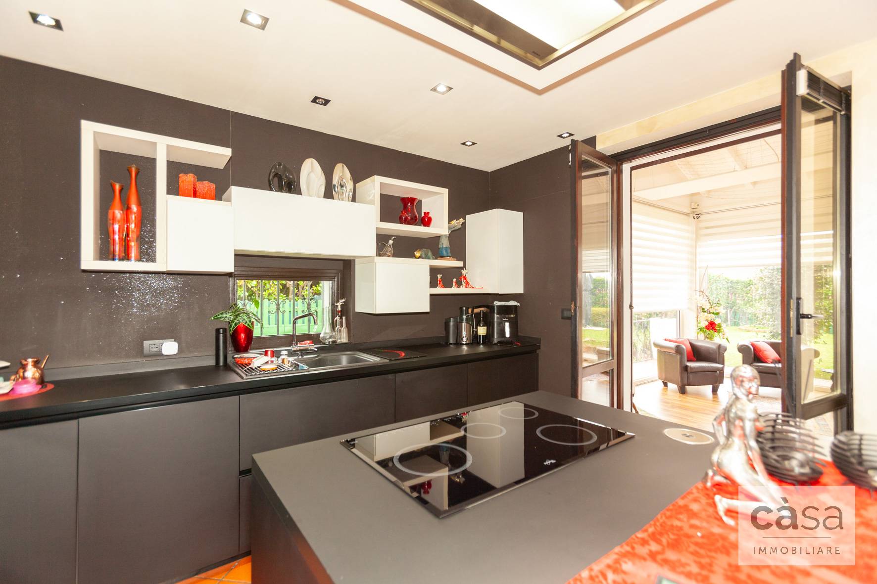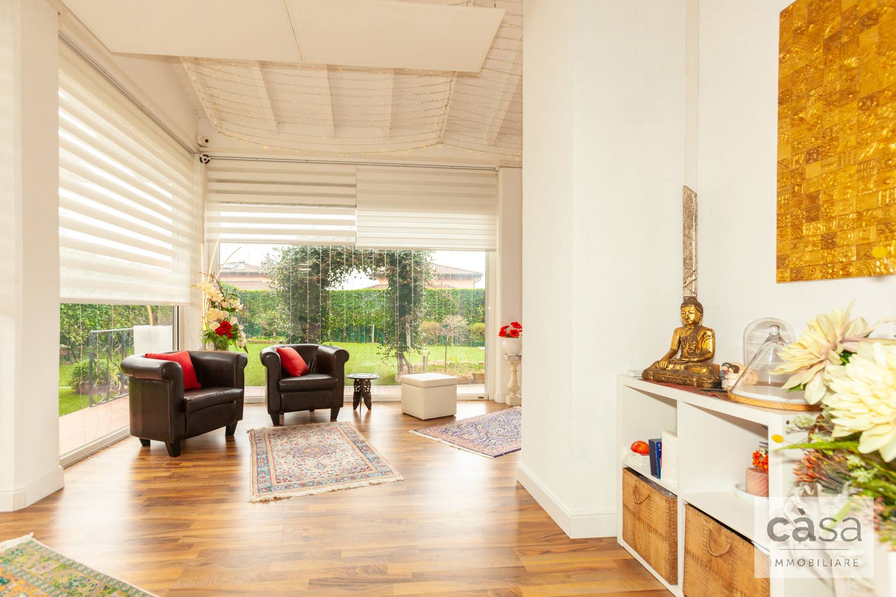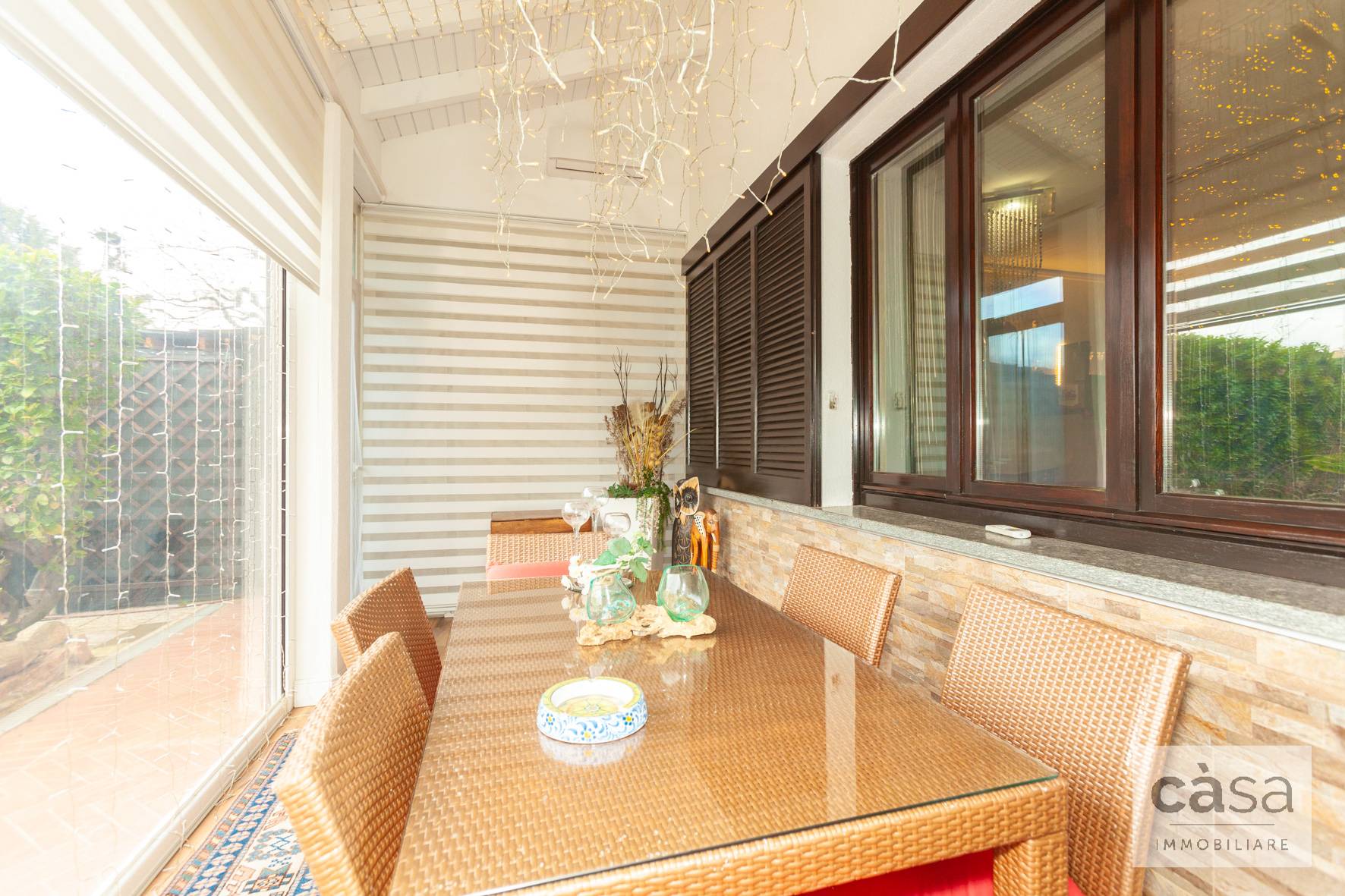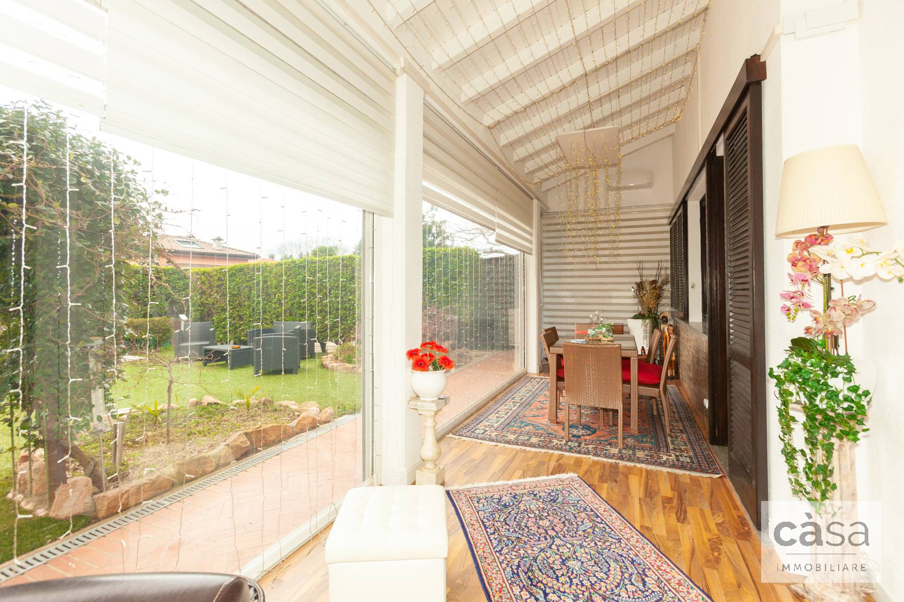 La zona giorno ha accesso diretto a una veranda di circa 30 mq, attrezzata con tapparelle elettriche di sicurezza e ideale come giardino dinverno con vista sul giardino privato.