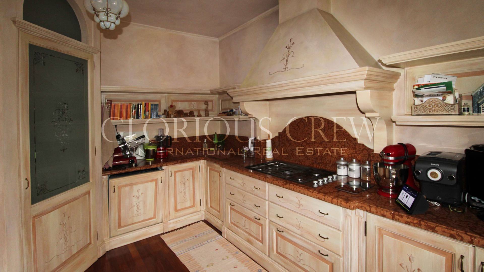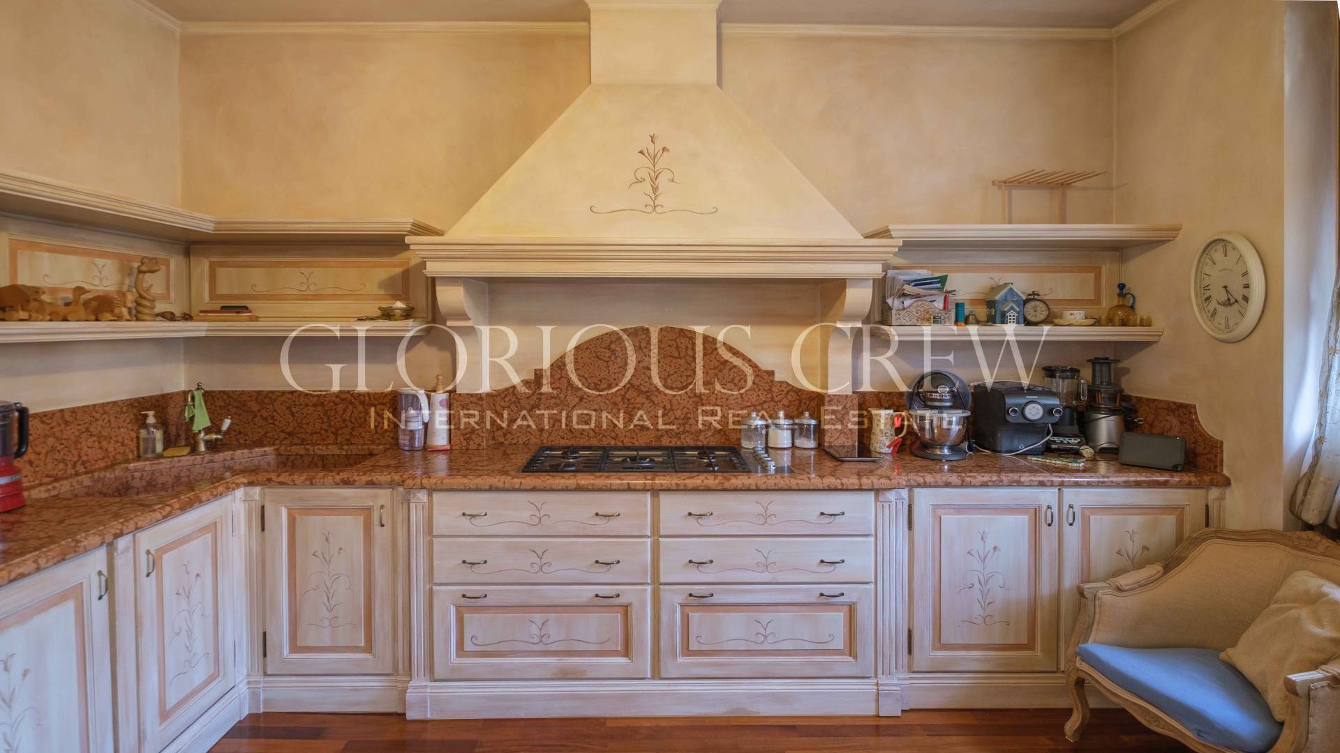 La zona giorno comprende inoltre una cucina abitabile su misura, con piani in marmo e comoda dispensa, oltre a un bagno di servizio.