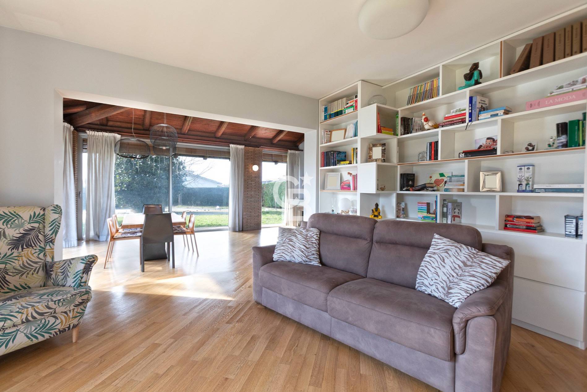 L'ingresso si apre su una zona living open space di MQ 70 ca. con camino, cucina a vista e vetrate panoramiche sul giardino di MQ 1350 ca. che circonda la propriet su 4 lati. La zona notte composta da 3 camere da letto di cui la padronale con bagno en-suite, un'ulteriore bagno e ripostiglio.