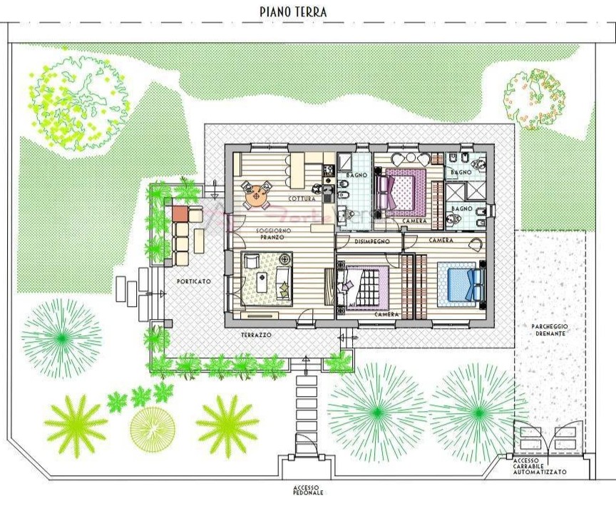 Spazi Esterni: Goditi le tue serate estive sul porticato e sulla terrazza, circondato da un curato giardino di mq. 500 con posto auto. Dotazioni e Comfort: Irrigazione: Sistema di irrigazione automatica con pozzo per un giardino sempre verde.